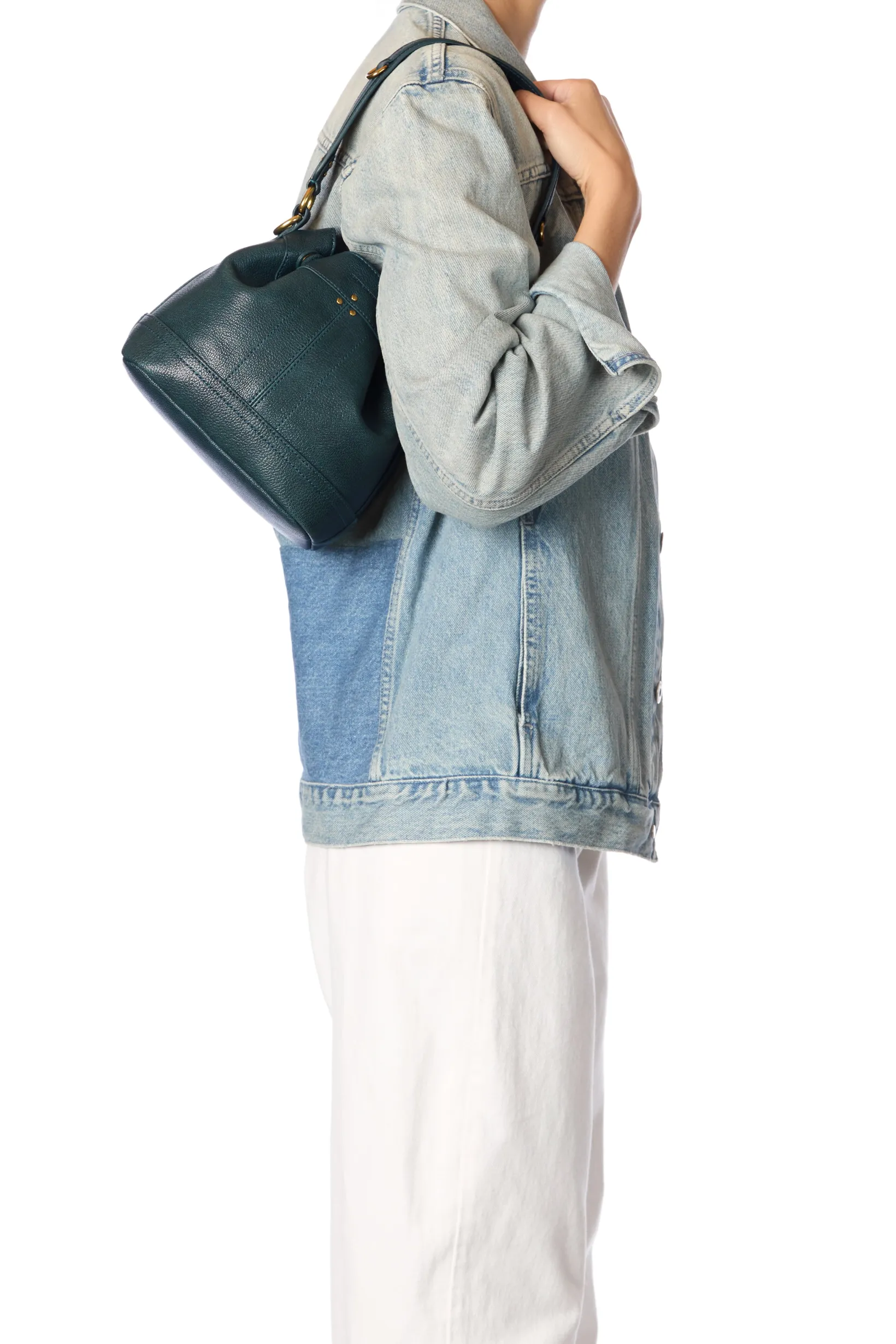 Adjustable snap closure. Worn on the shoulder or crossed. Detachable leather shoulder strap. Inside pocket with a keychain link inside the bag.