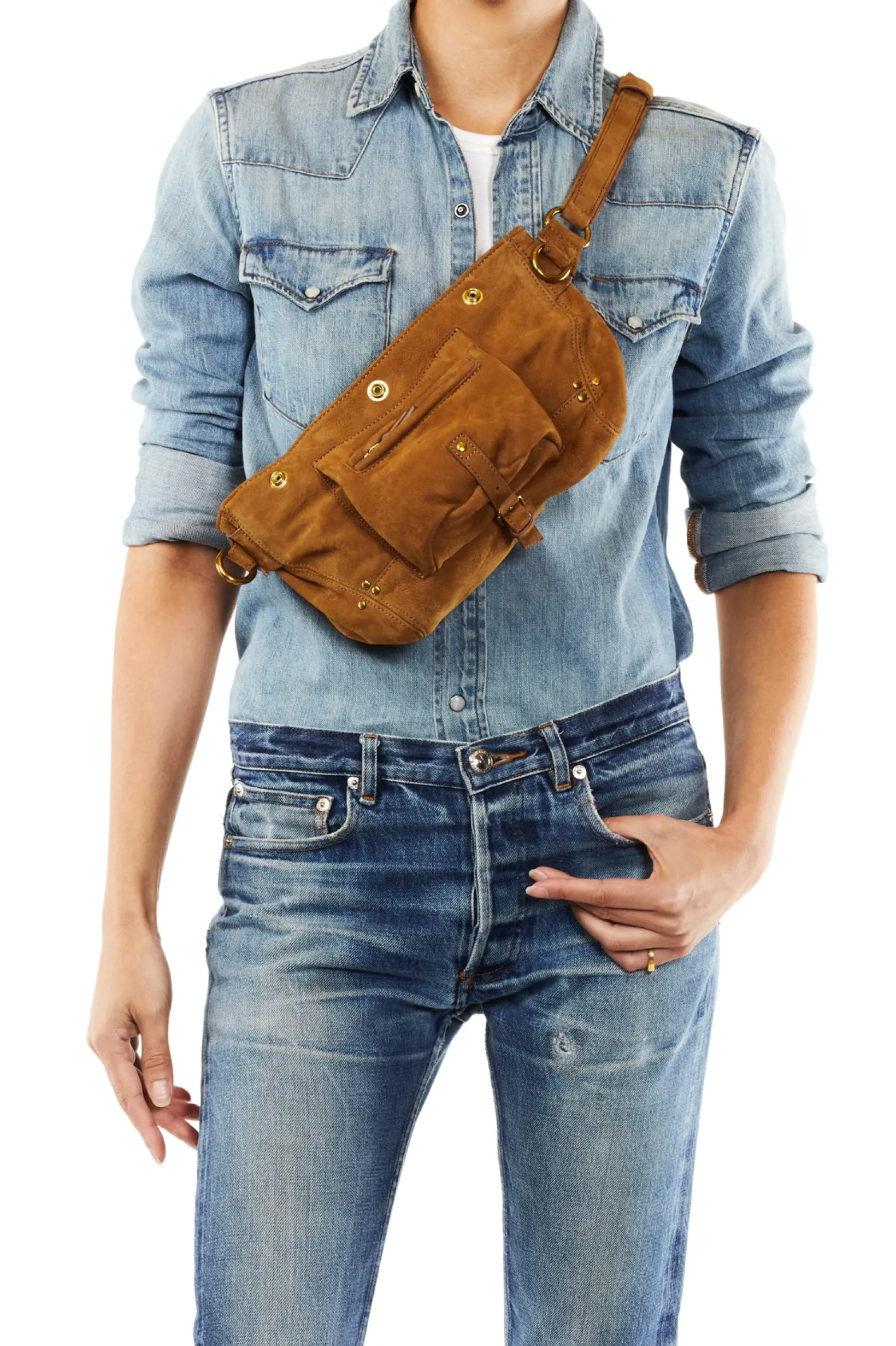 Zip closing on the top of the bag. A belt adjustable to a maximum of 86.5cm. One inside patch pocket. One outside zipped pocket.