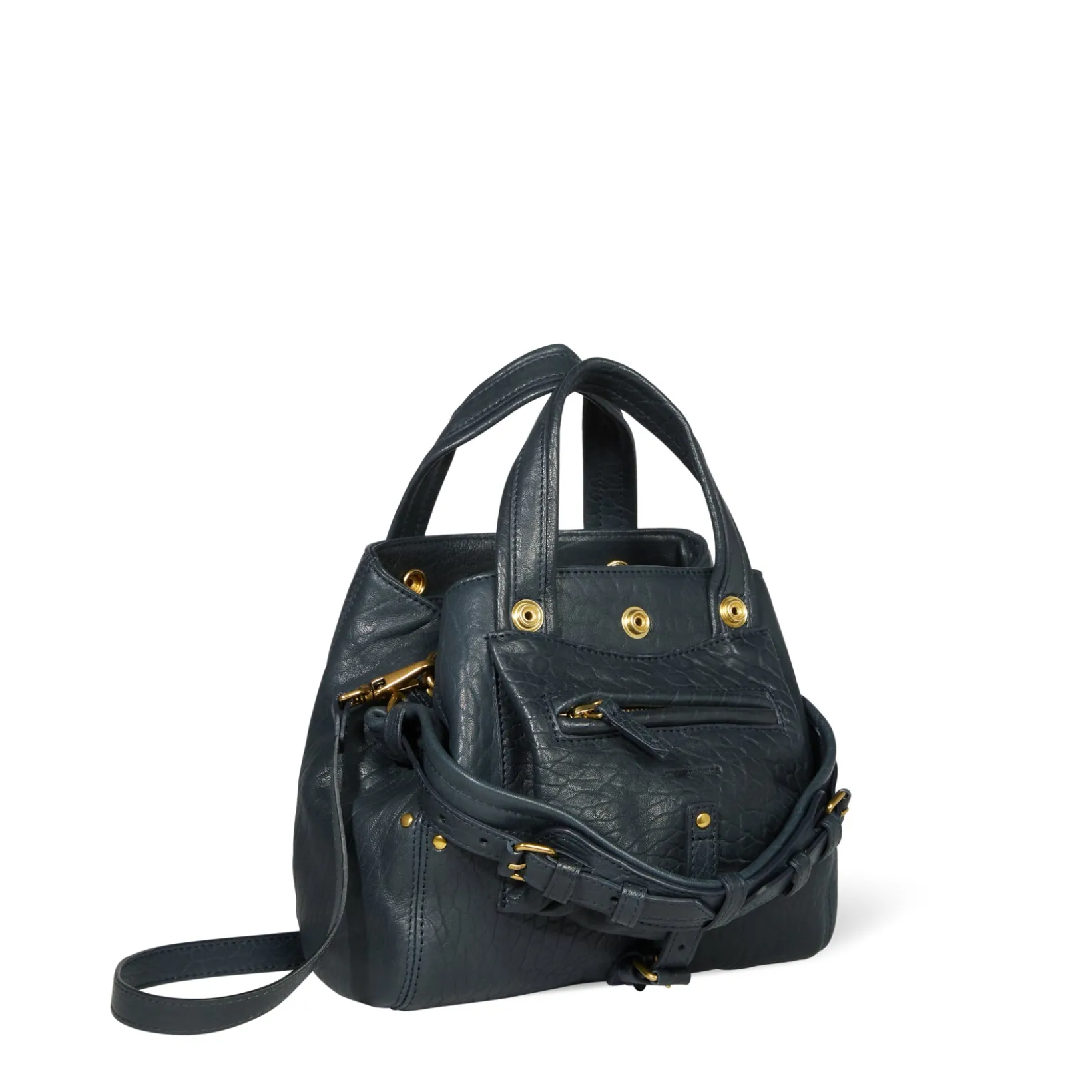 Two leather handles on the top of the bag, height 9 cm. A removable and adjustable leather shoulder strap of maximum 130cm. One external zipped pocket on the front of the bag. One inside pocket. A key ring inside the bag.