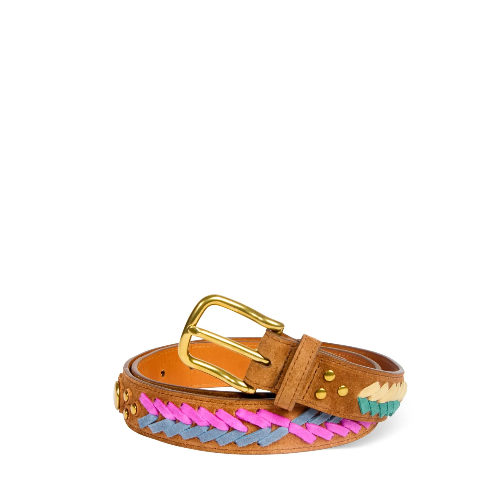 Belt with large domed metal rivets. Adjustable waistband. Can be worn hip-high or high-waisted.