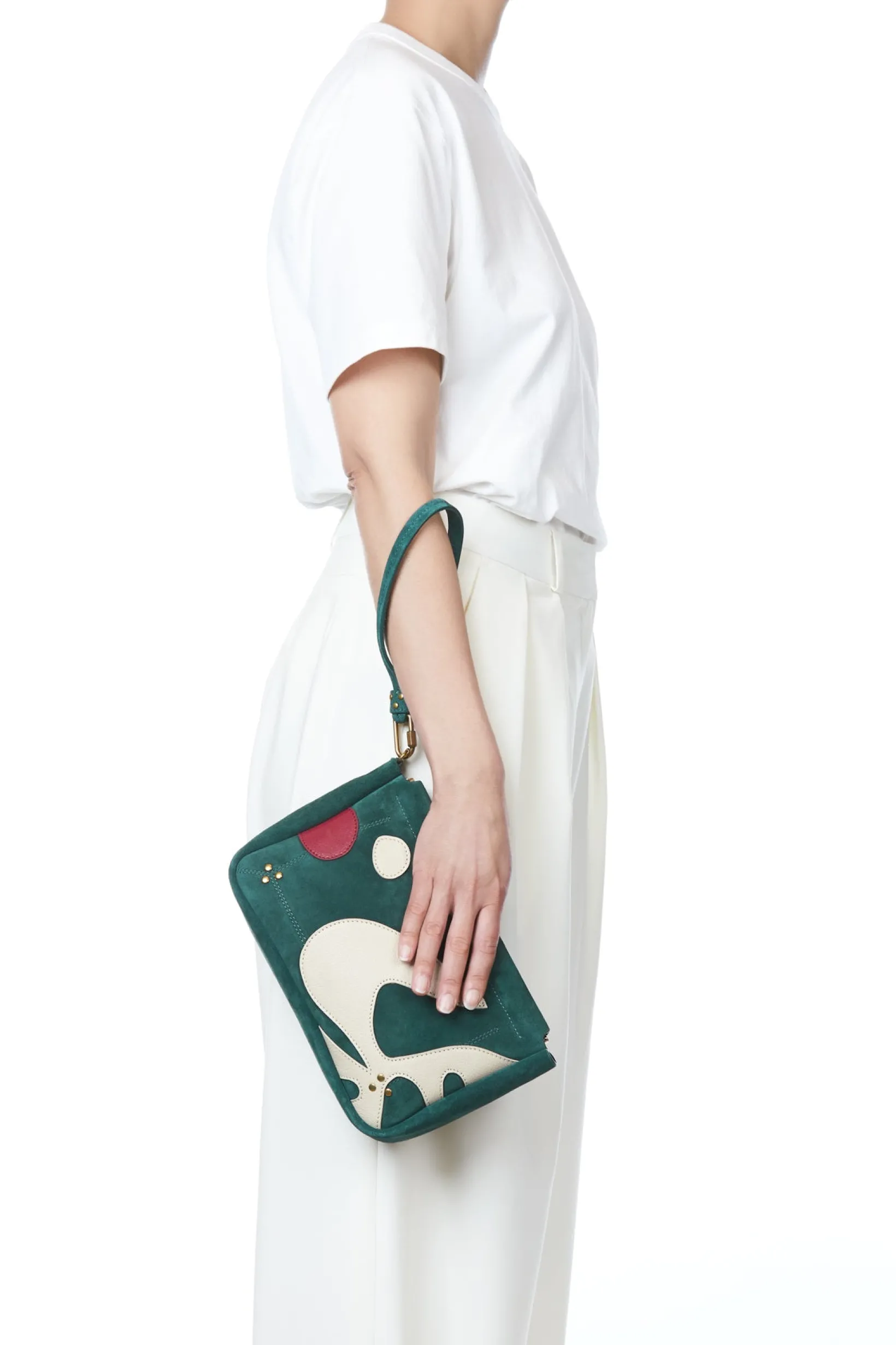 Hand-held, or to slip into a large tote bag. Removable strap thanks to the screw carabiner. Snap closure.