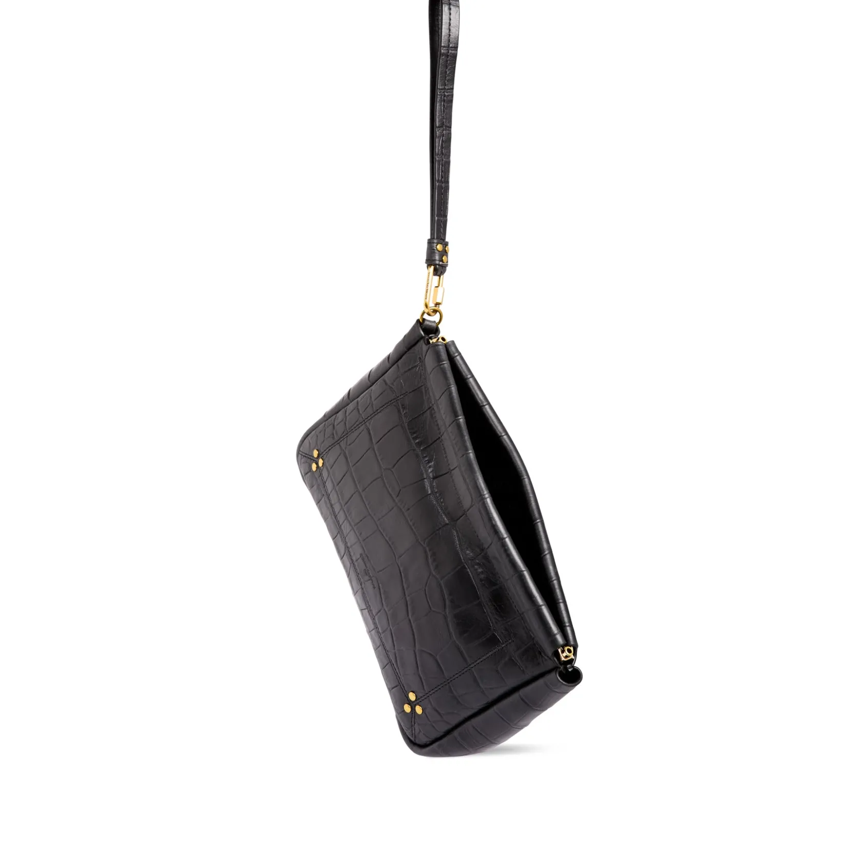 Hand-held, or to slip into a large tote bag. Removable strap thanks to the screw carabiner. Snap closure.