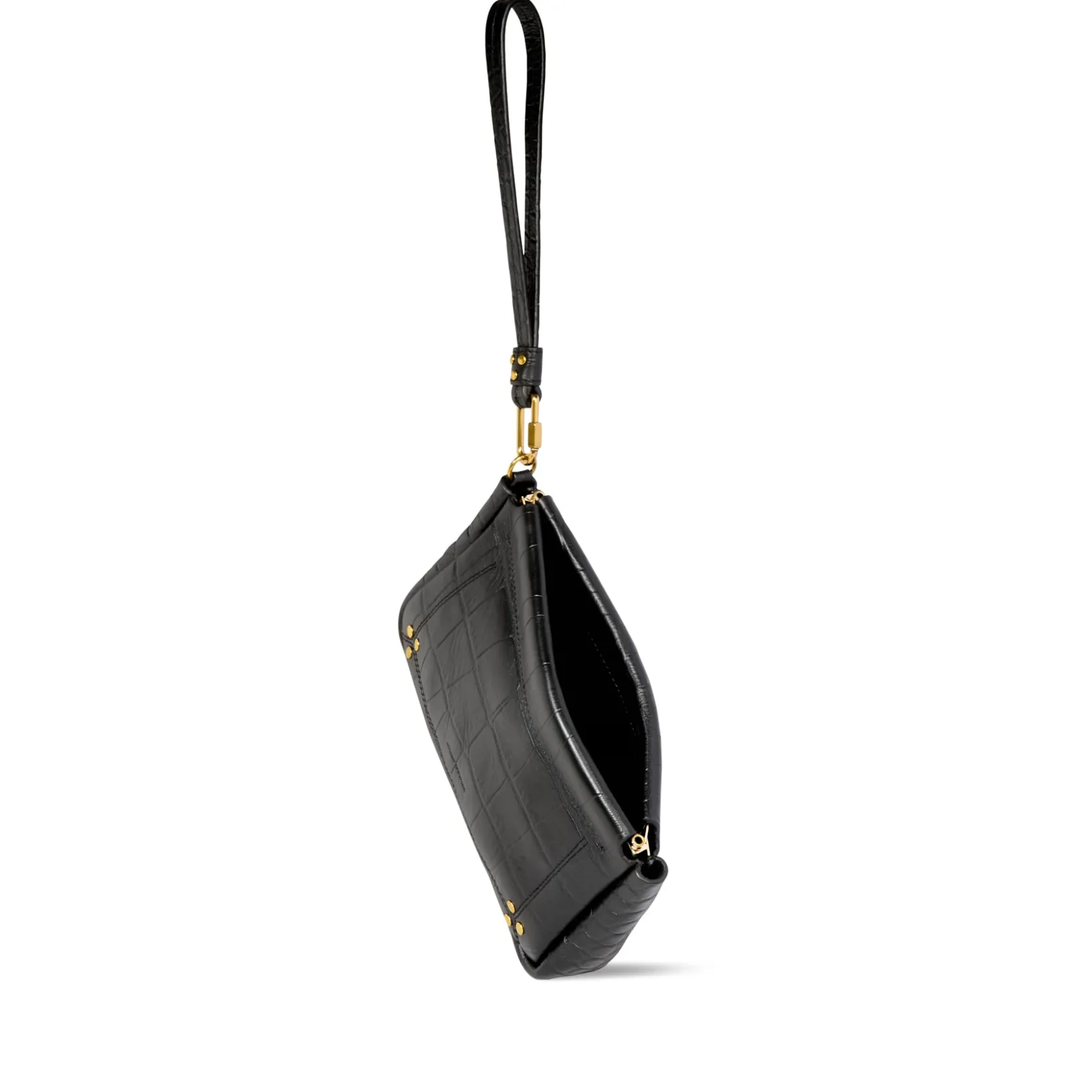 Hand-held, or to slip into a large tote bag. Removable strap thanks to the screw carabiner. Snap closure.
