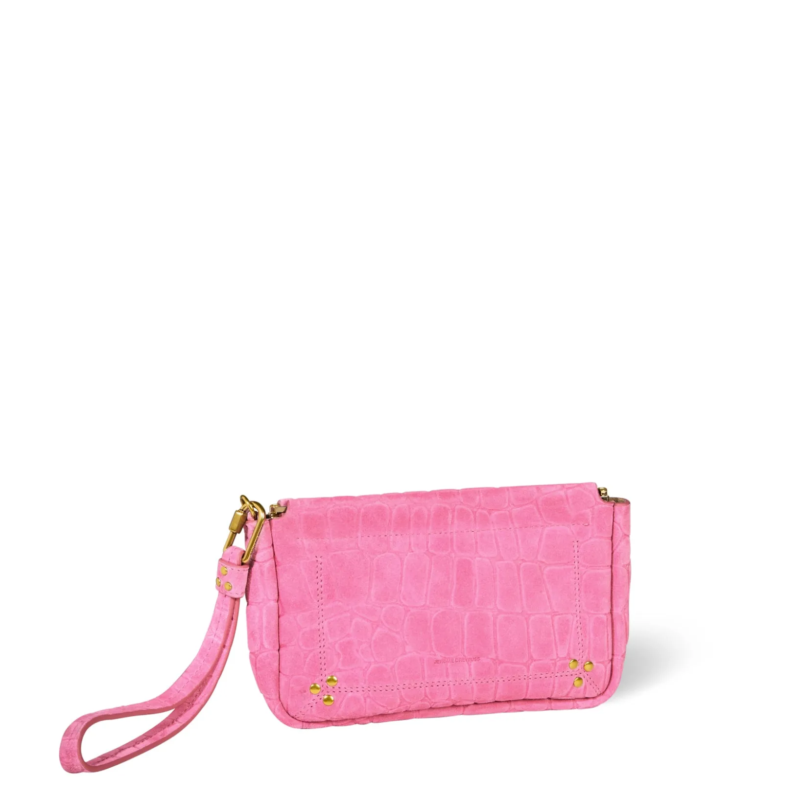 Hand-held, or to slip into a large tote bag. Removable strap thanks to the screw carabiner. Snap closure.