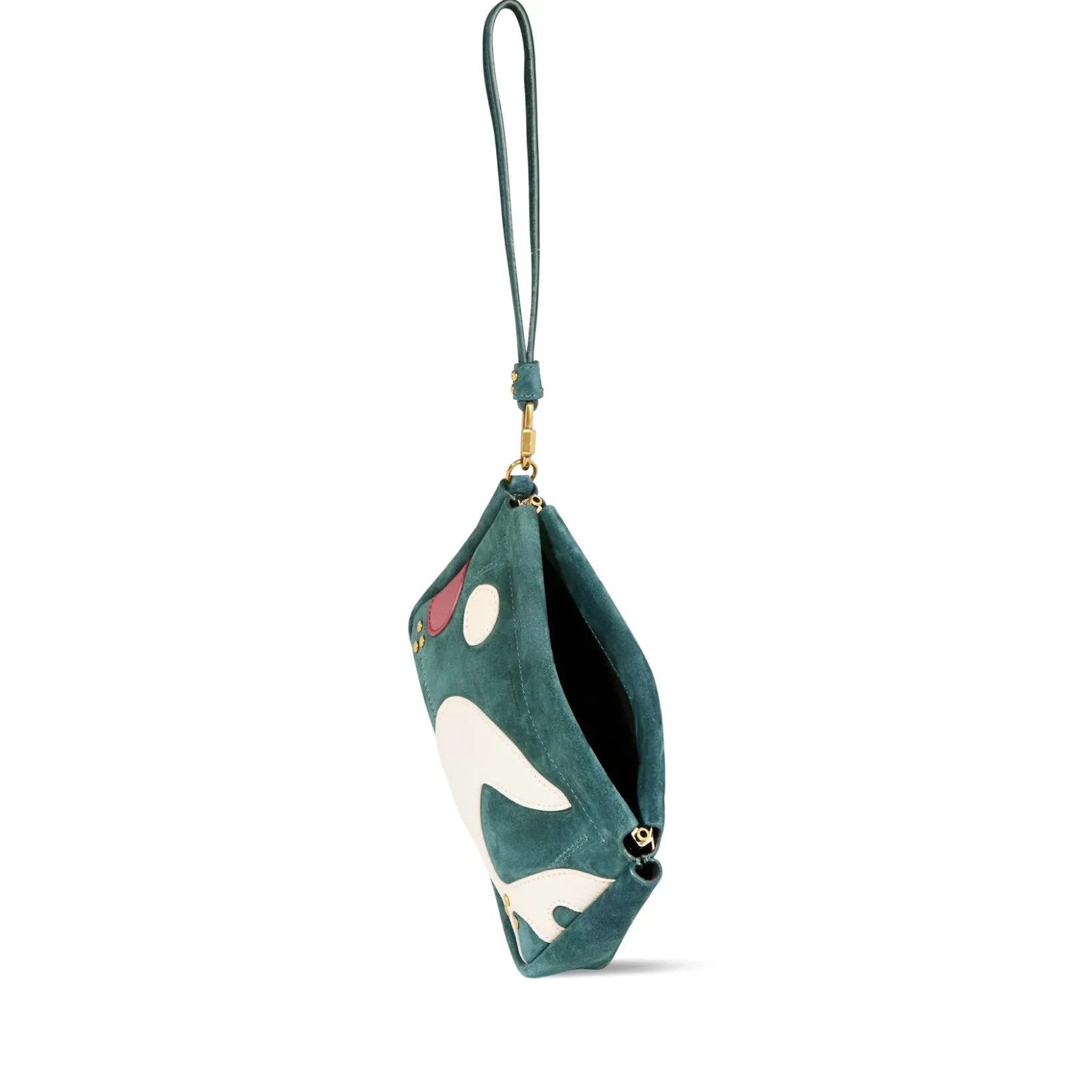 Hand-held, or to slip into a large tote bag. Removable strap thanks to the screw carabiner. Snap closure.