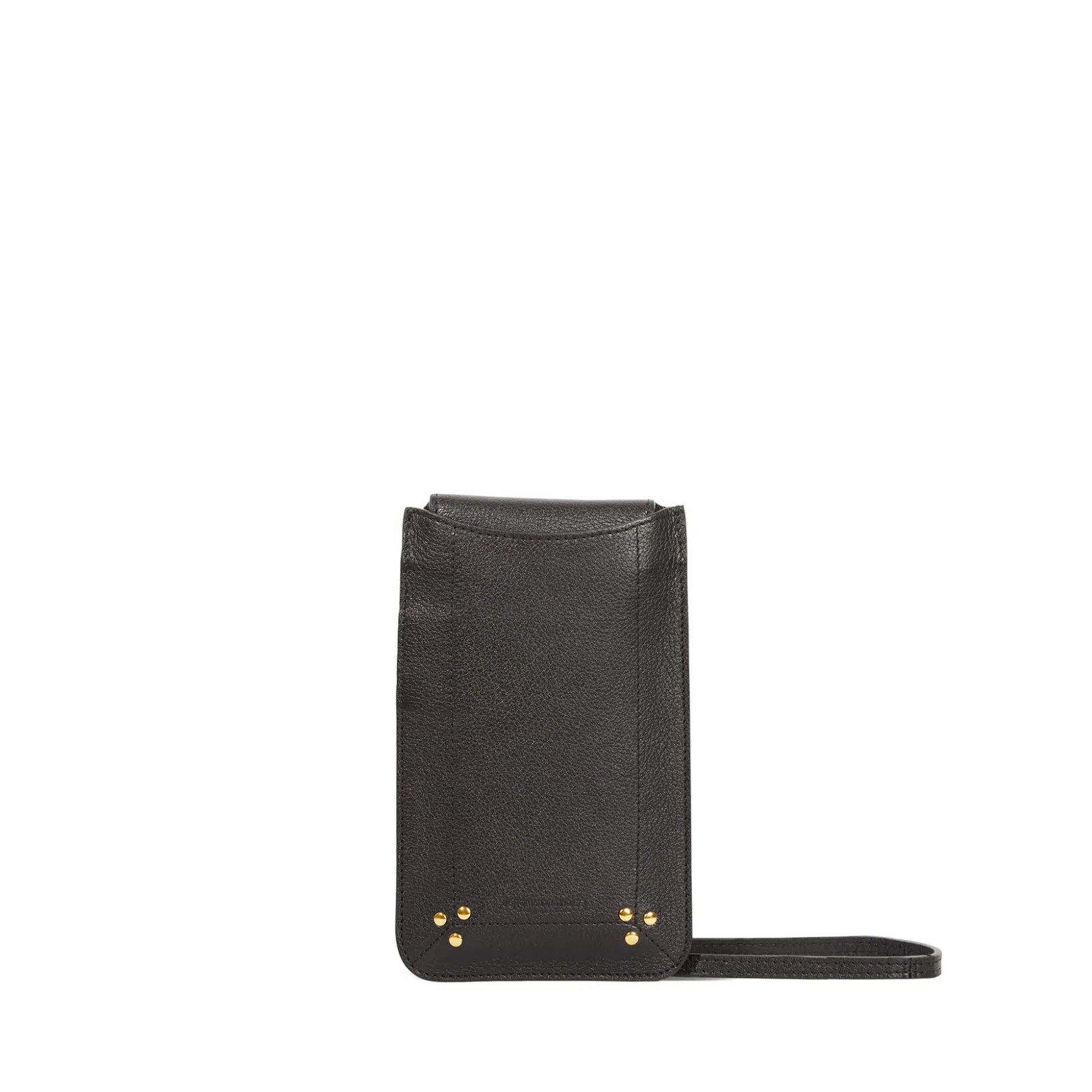 Phone case, to wear cross-body. Snap button closure. Leather strap.