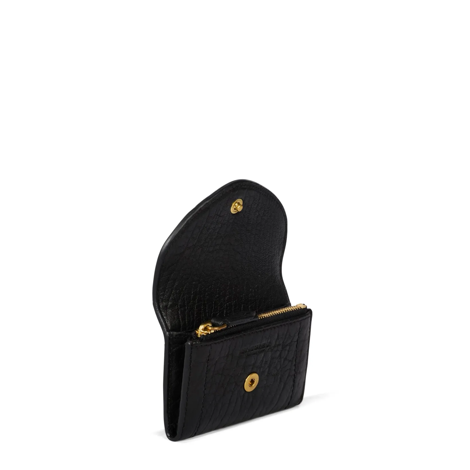 A zipped coin compartment. A storage for bills. Six card compartments. A patch pocket inside and under the flap.