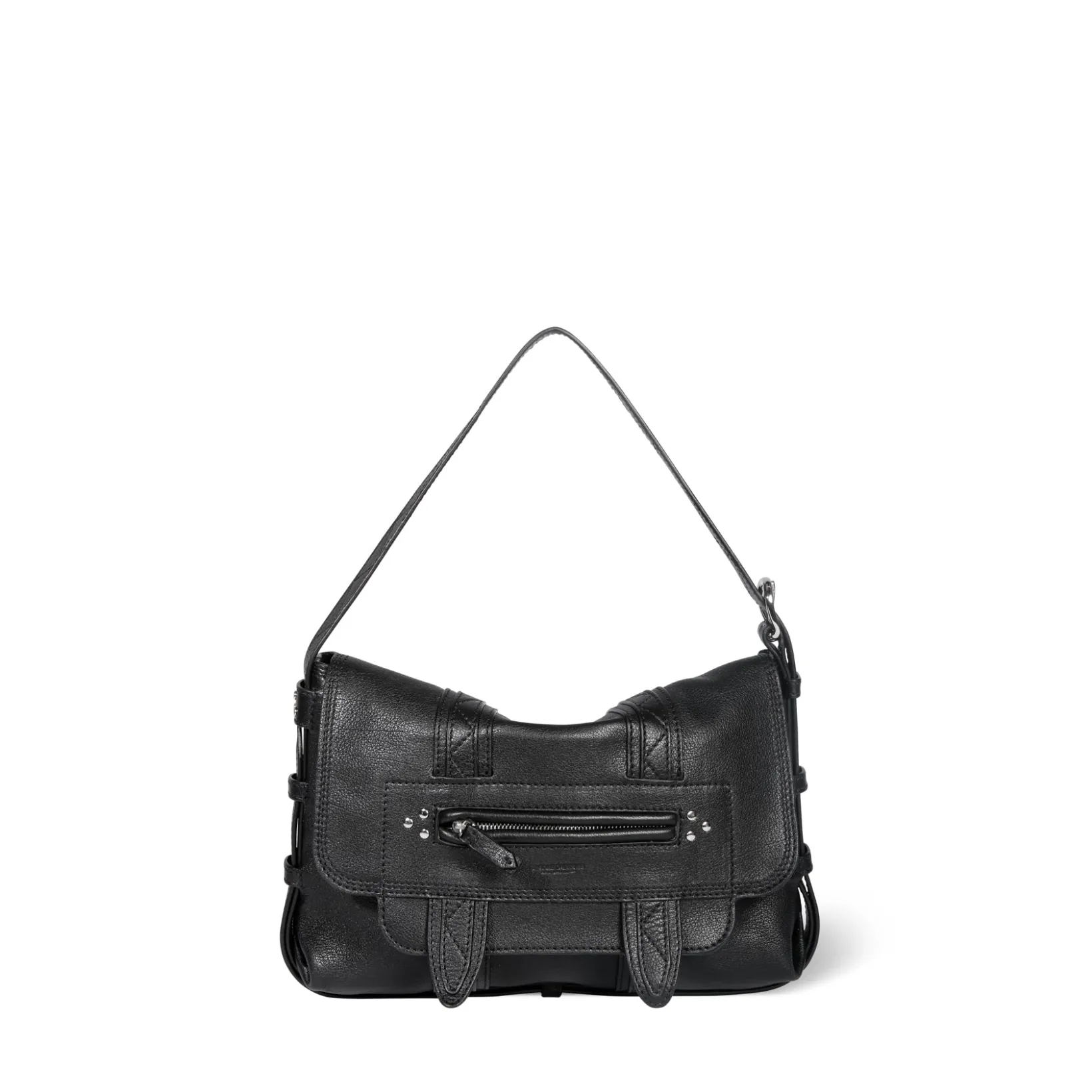 Leather flap with magnetic snap fastening. Adjustable leather shoulder strap measuring a maximum of 101cm. One inside pocket. One zipped outsided pocket.