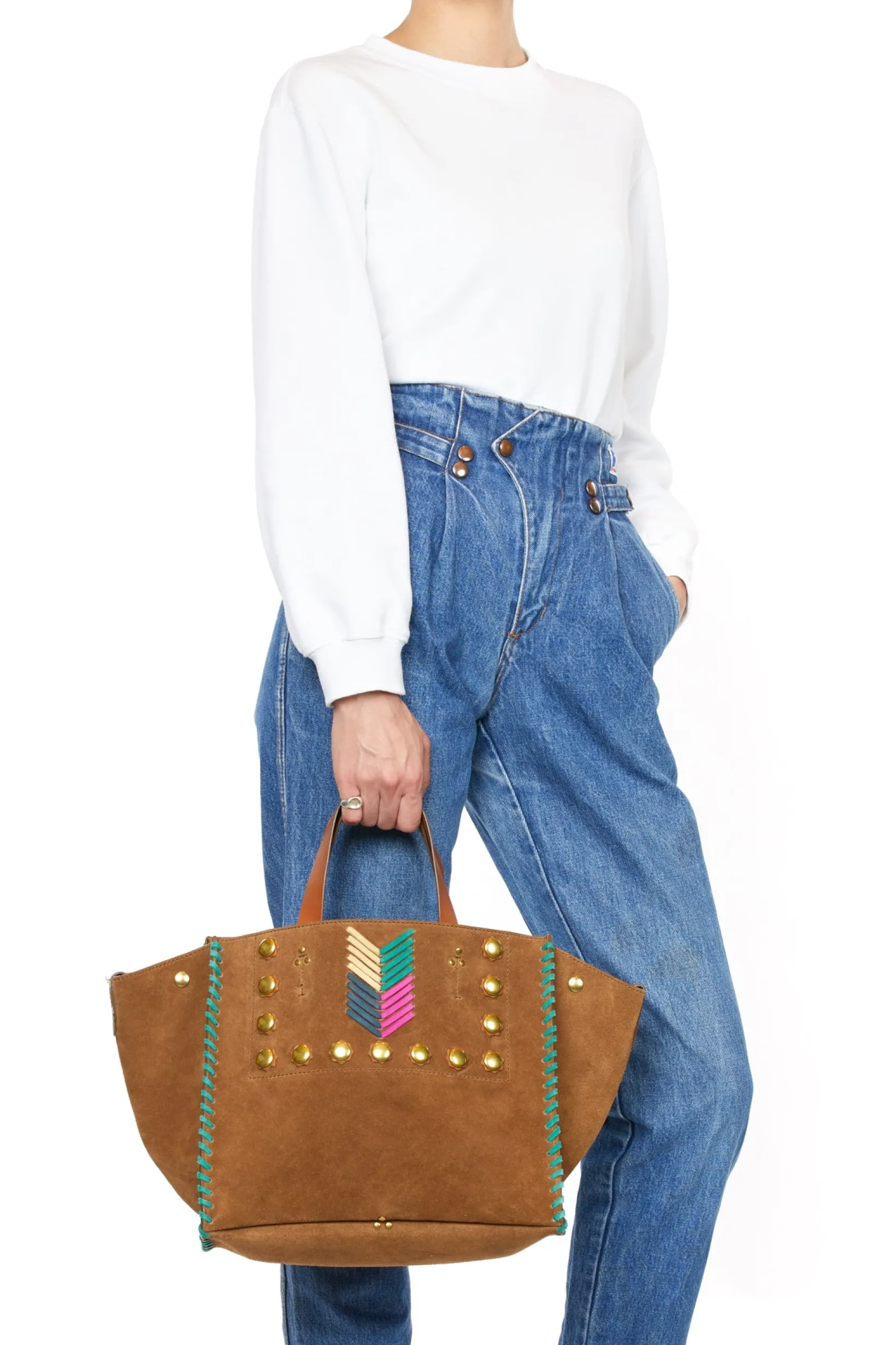 Closing by leather tabs with pressure. Four handles, of two lengths, in leather on the top of the bag. Organized bag with a large compartment and a leather pouch hanging by a link inside.