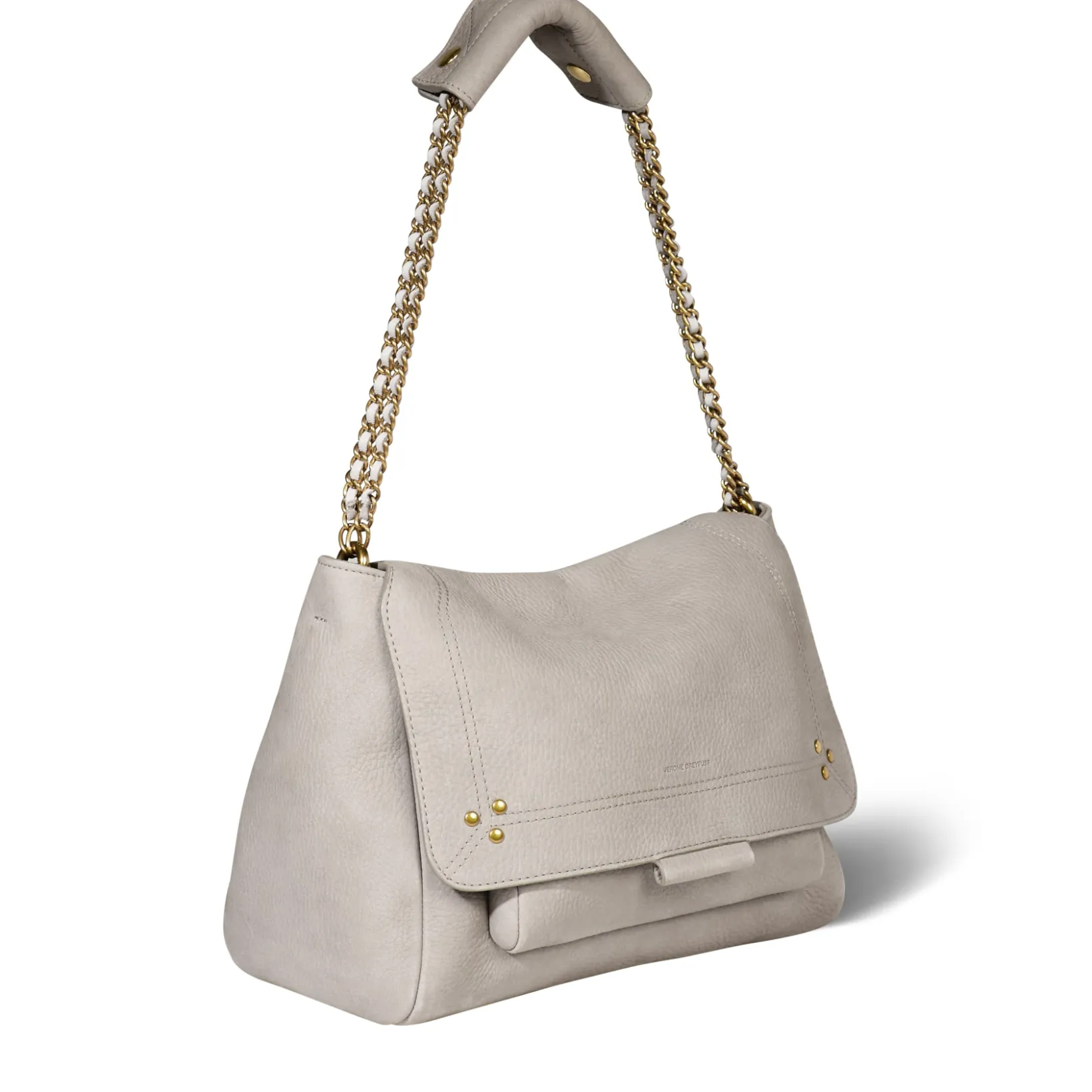 Adjustable chain and leather shoulder strap measuring 105 cm. Wide leg shoulder belt. Flap with snap button closure. One small pocket under the flap. One exterior zipped pocket. One interior pocket. One key hook inside.