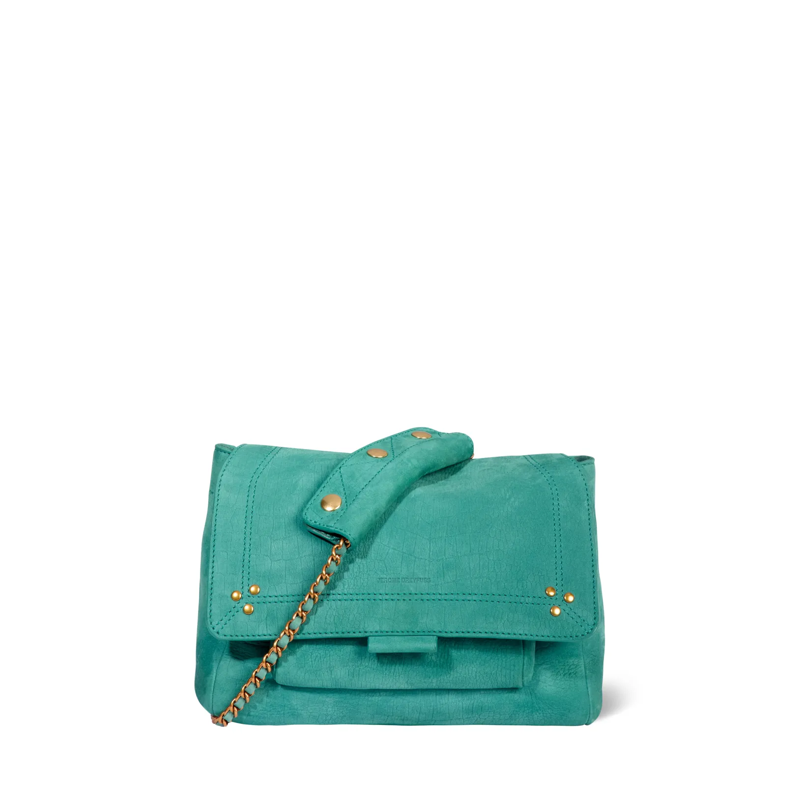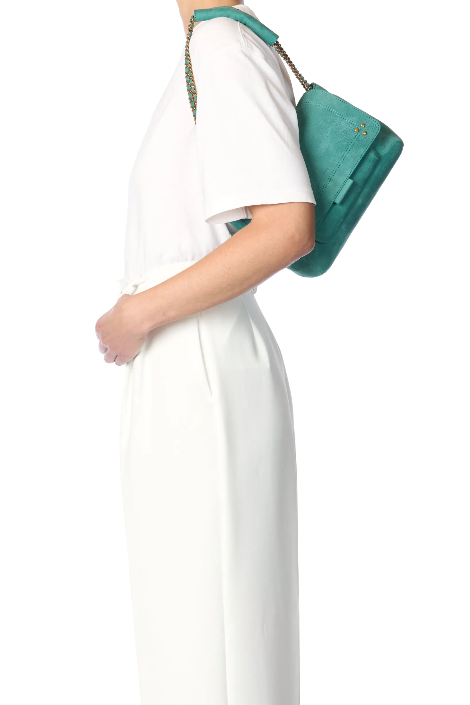 Adjustable chain and leather shoulder strap measuring 105 cm. Wide leg shoulder belt. Flap with snap button closure. One small pocket under the flap. One exterior zipped pocket. One interior pocket. One key hook inside.