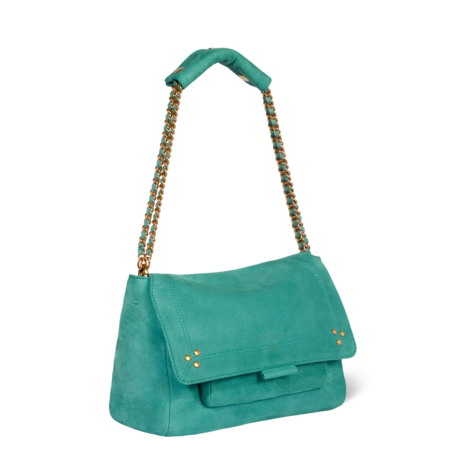 Adjustable chain and leather shoulder strap measuring 105 cm. Wide leg shoulder belt. Flap with snap button closure. One…