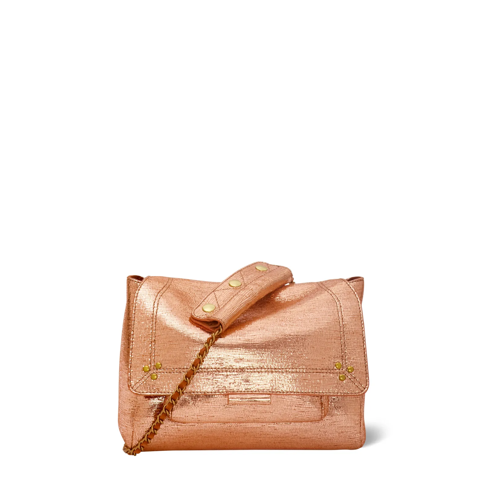 Adjustable chain and leather shoulder strap measuring 105 cm. Wide leg shoulder belt. Flap with snap button closure. One small pocket under the flap. One exterior zipped pocket. One interior pocket. One key hook inside.