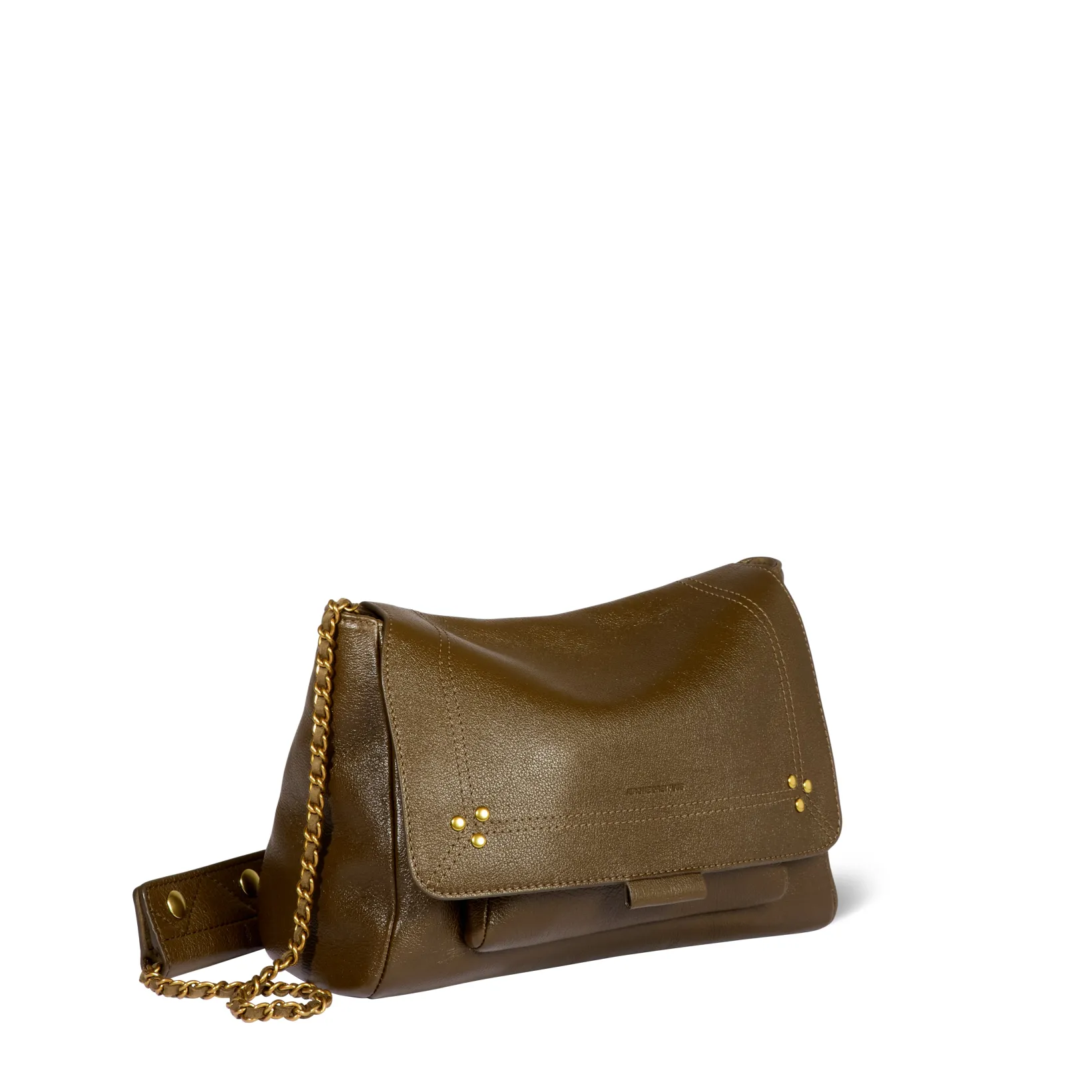 Adjustable chain and leather shoulder strap measuring 105 cm. Wide leg shoulder belt. Flap with snap button closure. One small pocket under the flap. One exterior zipped pocket. One interior pocket. One key hook inside.