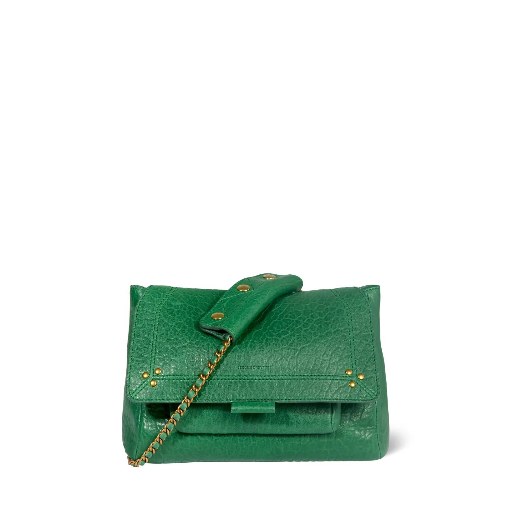 Adjustable chain and leather shoulder strap measuring 105 cm. Wide leg shoulder belt. Flap with snap button closure. One small pocket under the flap. One exterior zipped pocket. One interior pocket. One key hook inside.