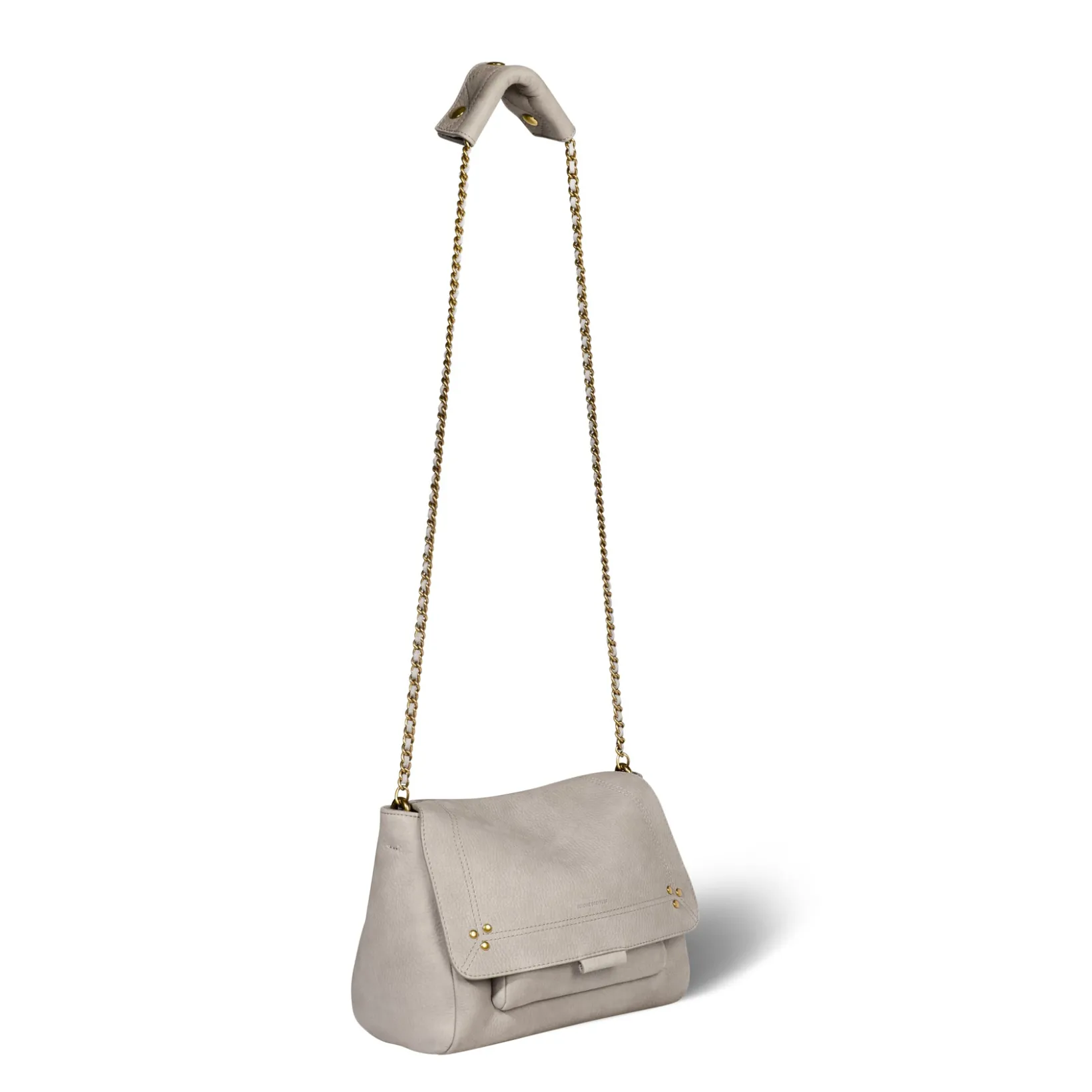 Adjustable chain and leather shoulder strap measuring 105 cm. Wide leg shoulder belt. Flap with snap button closure. One small pocket under the flap. One exterior zipped pocket. One interior pocket. One key hook inside.