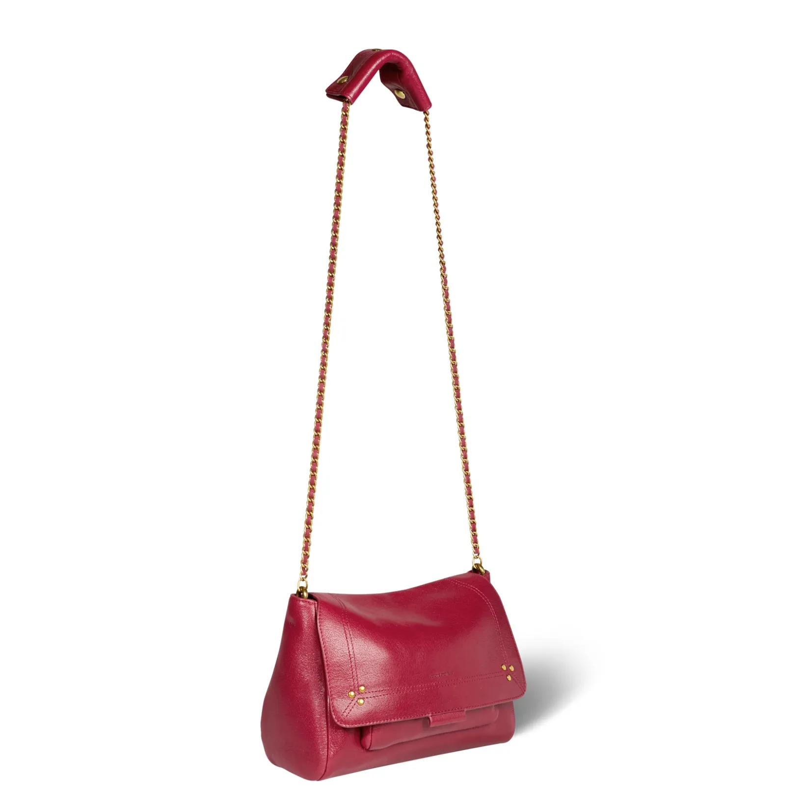 Adjustable chain and leather shoulder strap measuring 105 cm. Wide leg shoulder belt. Flap with snap button closure. One small pocket under the flap. One exterior zipped pocket. One interior pocket. One key hook inside.