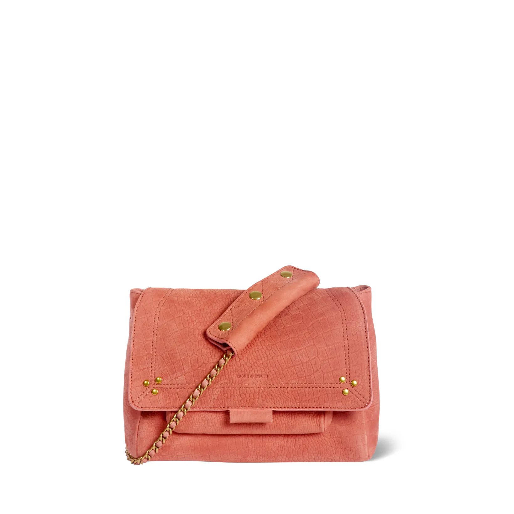 Adjustable chain and leather shoulder strap measuring 105 cm. Wide leg shoulder belt. Flap with snap button closure. One small pocket under the flap. One exterior zipped pocket. One interior pocket. One key hook inside.