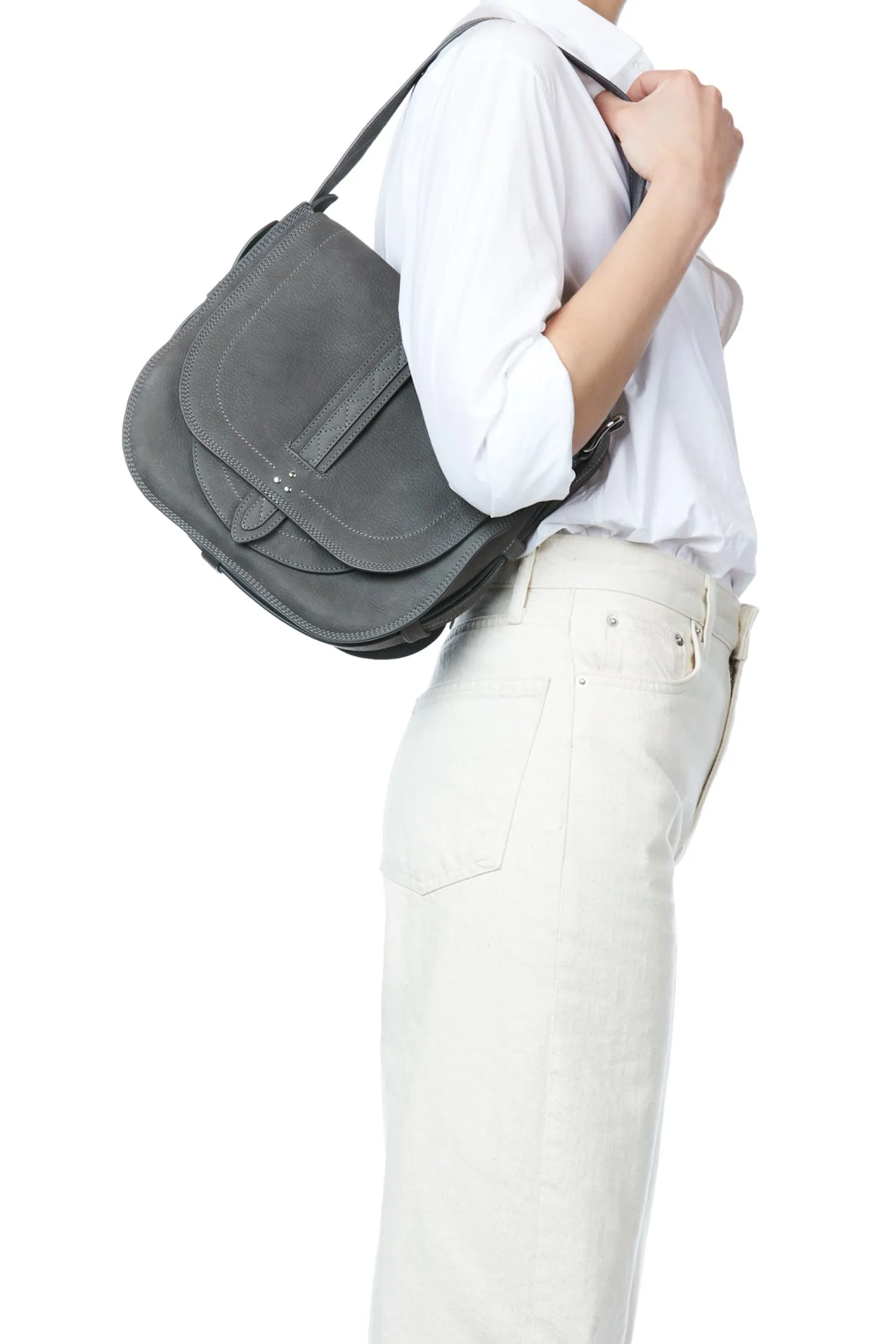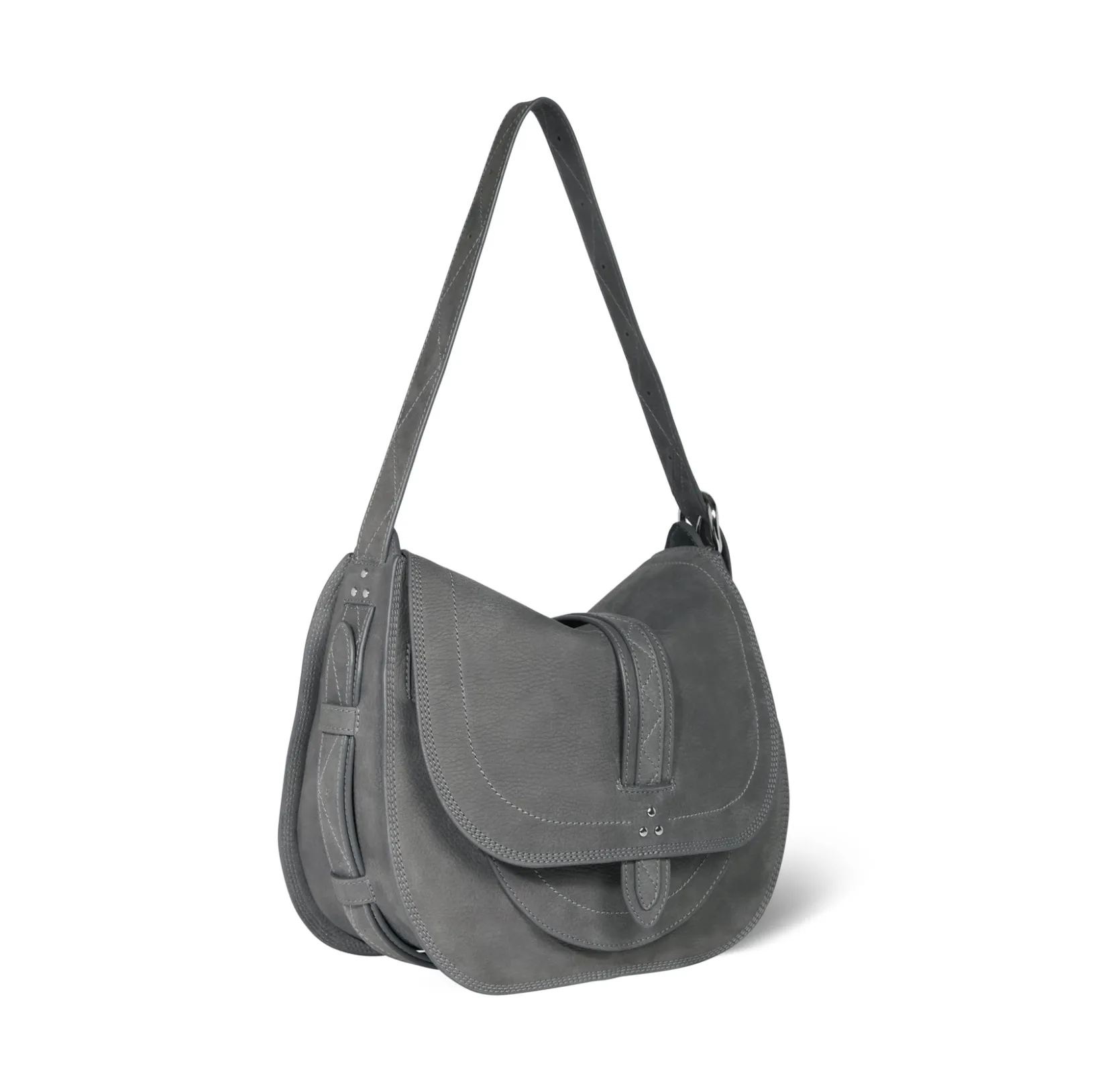 Closing with a leather flap. A removable leather shoulder strap, measuring a maximum of 82 cm. One outside pocket. One inside pocket with a fully zipped compartment. A keychain link inside the bag.