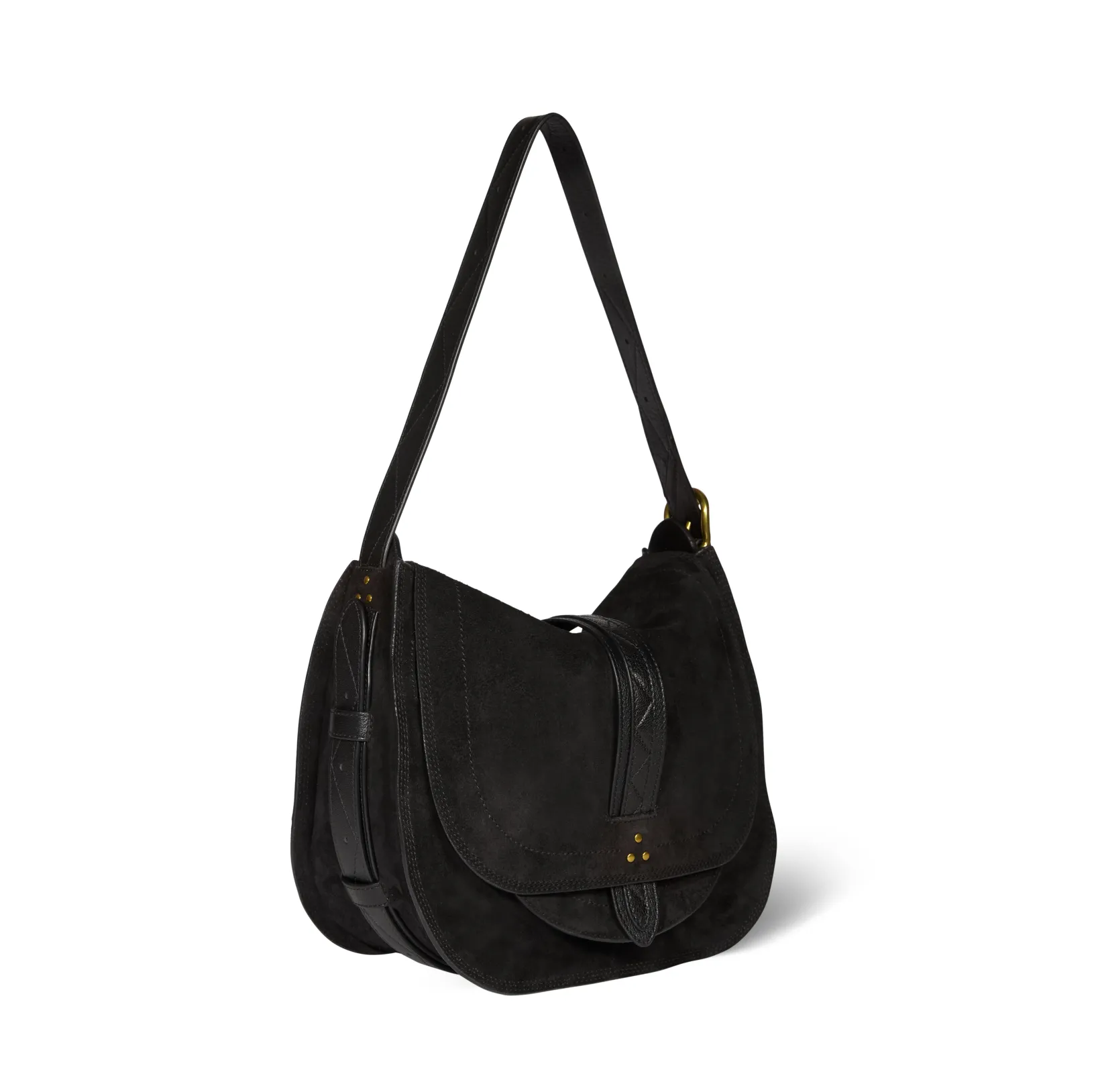 Closing with a leather flap. A removable leather shoulder strap, measuring a maximum of 82 cm. One outside pocket. One inside pocket with a fully zipped compartment. A keychain link inside the bag.