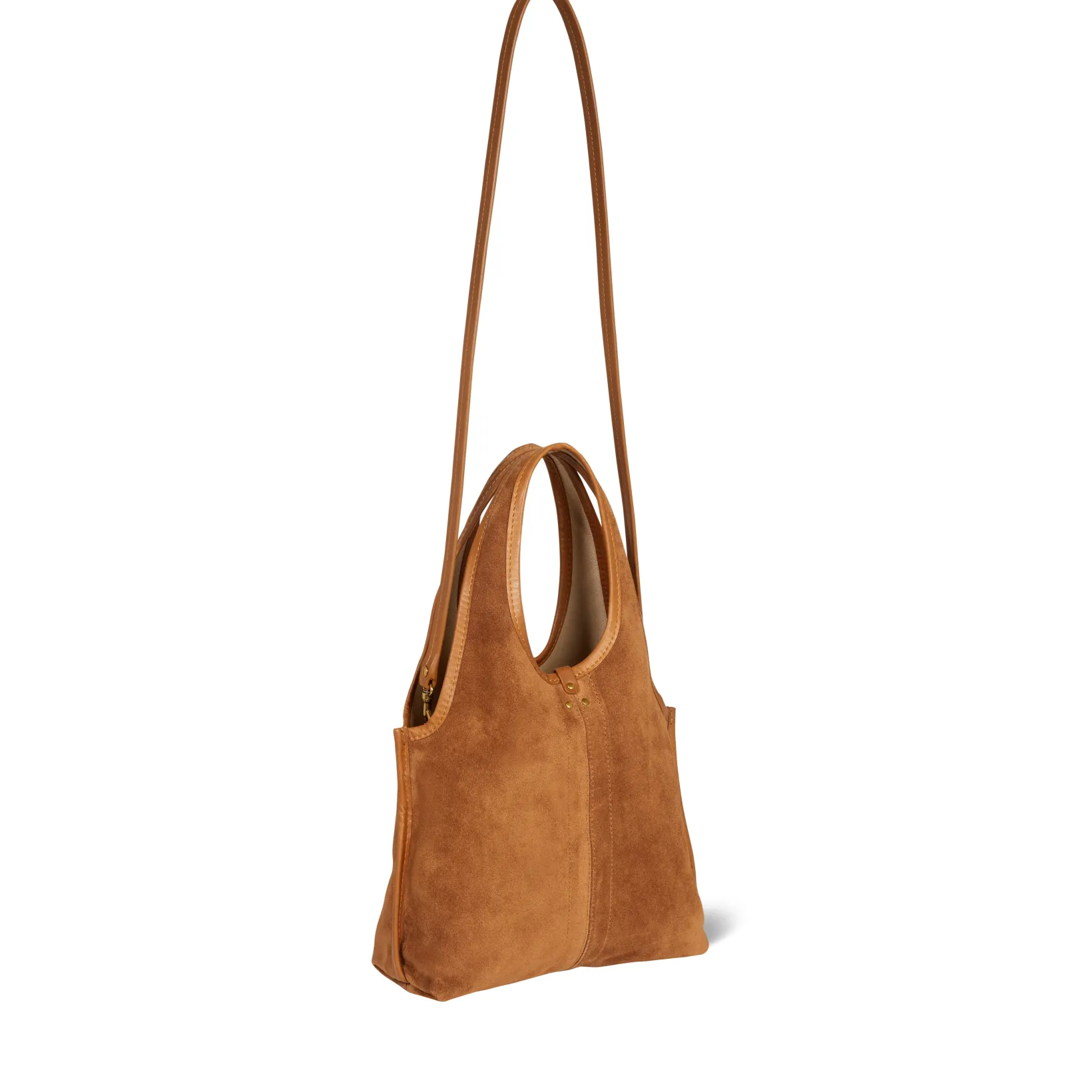 Soft tote bag with round handles, worn over the shoulder, by hand, or crossbody with its removable shoulder strap.Remova…