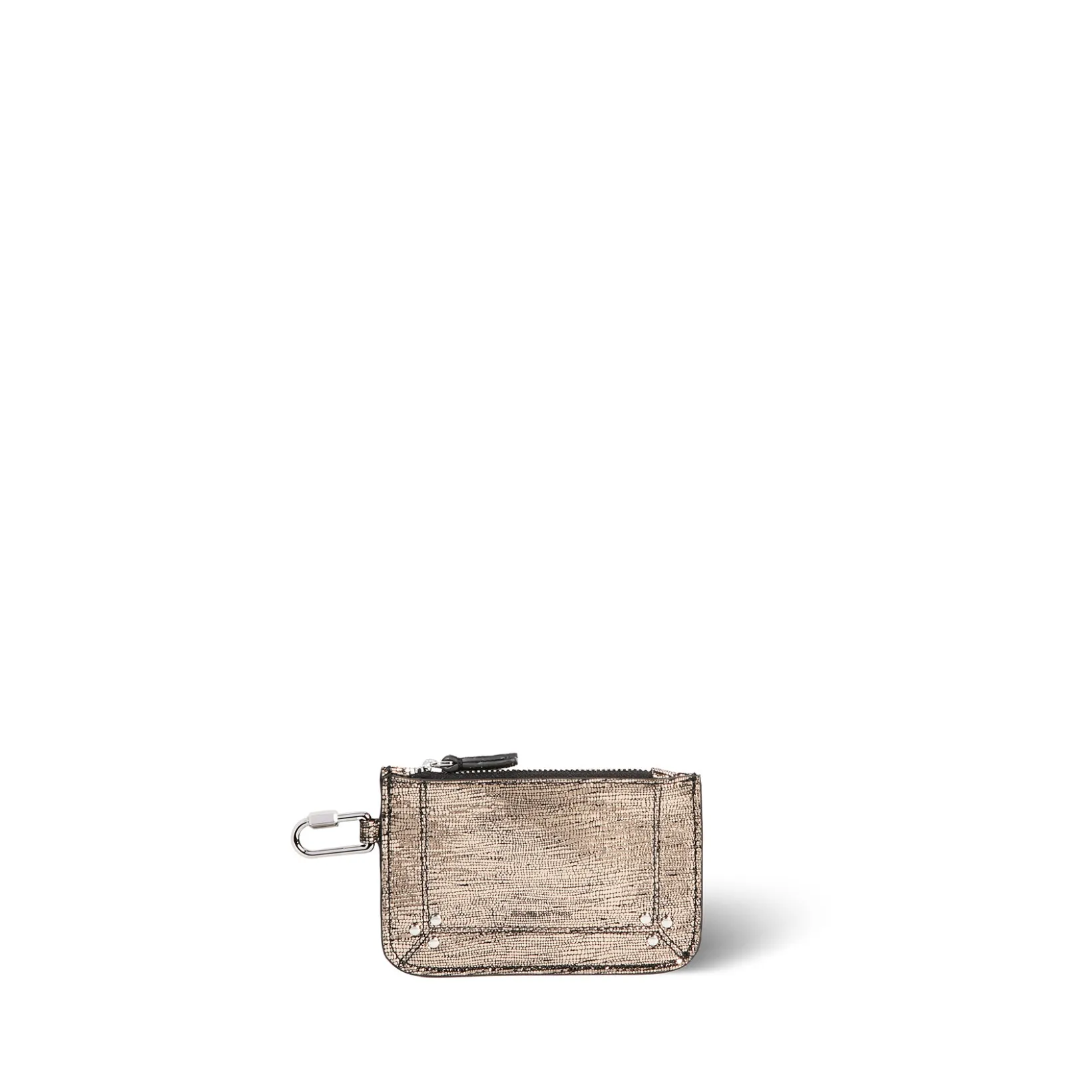 Zip closure. Features a ring that can hook inside your handbag to the key fob.
