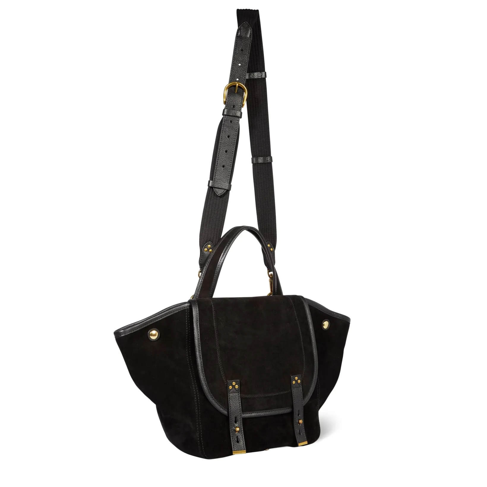 Basket-style tote bag, can be worn on the shoulder, across the chest or by hand. Adjustable, removable shoulder strap. Closing with a leather flap.