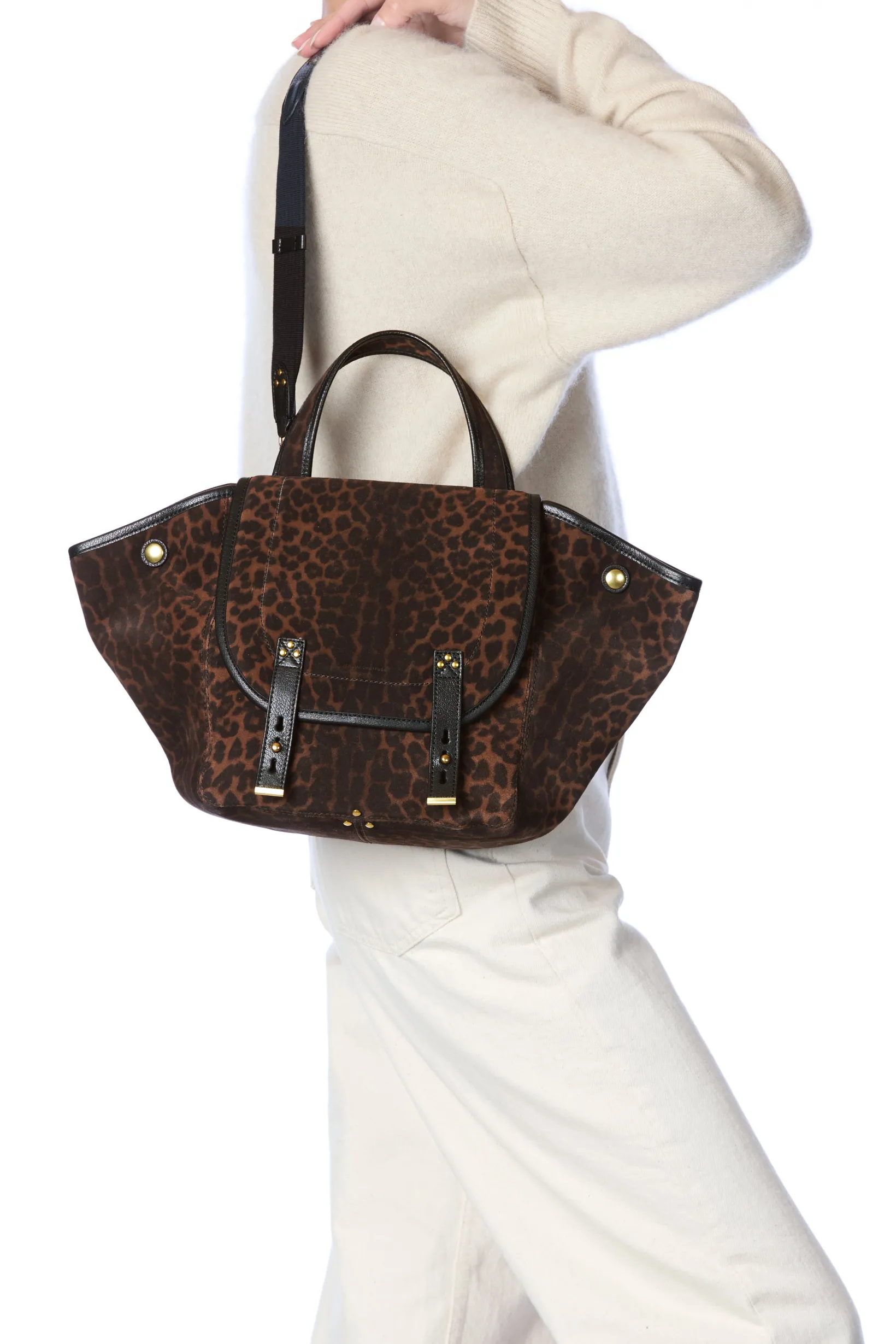 Basket-style tote bag, can be worn on the shoulder, across the chest or by hand. Adjustable, removable shoulder strap. Closing with a leather flap.