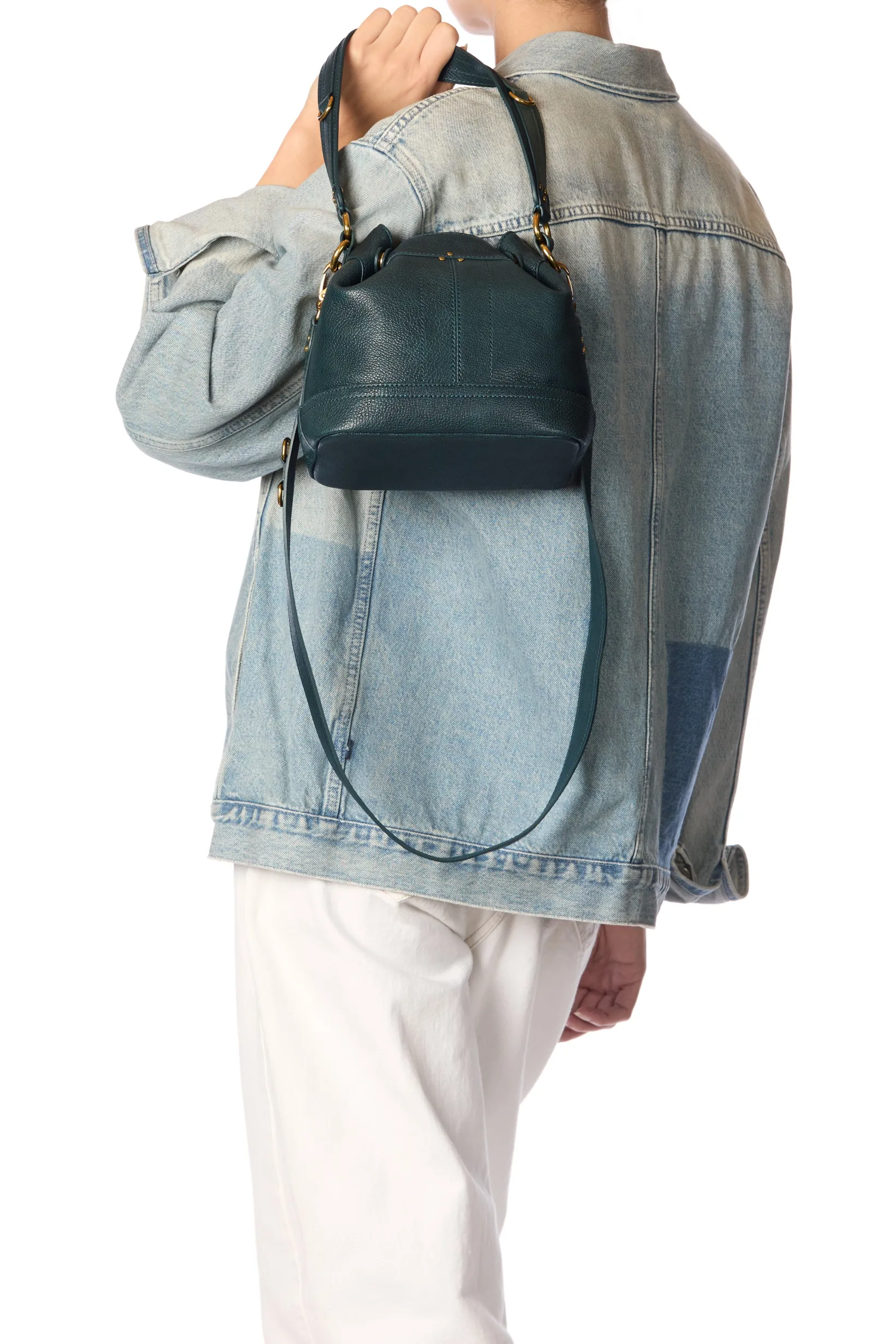 Adjustable snap closure. Worn on the shoulder or crossed. Detachable leather shoulder strap. Inside pocket with a keychain link inside the bag.