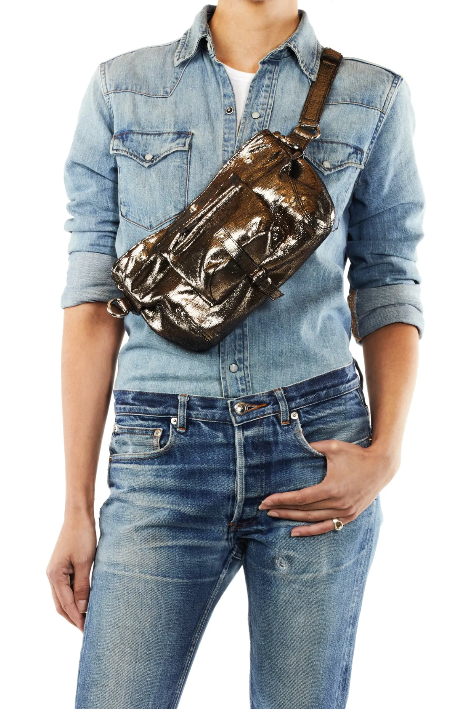 Zip closing on the top of the bag. A belt adjustable to a maximum of 86.5cm. One inside patch pocket. One outside zipped pocket.