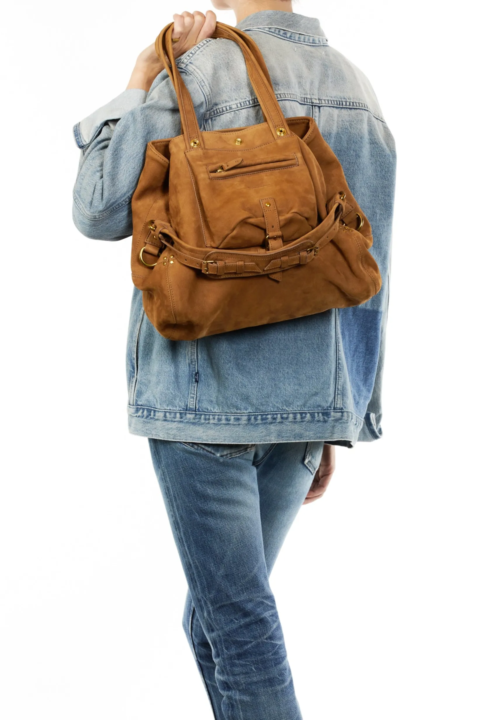 Two leather handles measuring 25cm, maximum lenght 50 cm. Non-adjustable leather strap measuring 48 cm. One exterior zip…