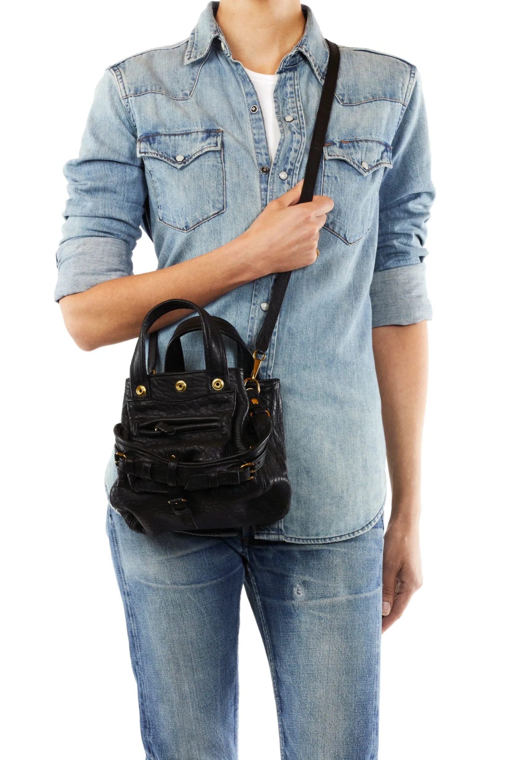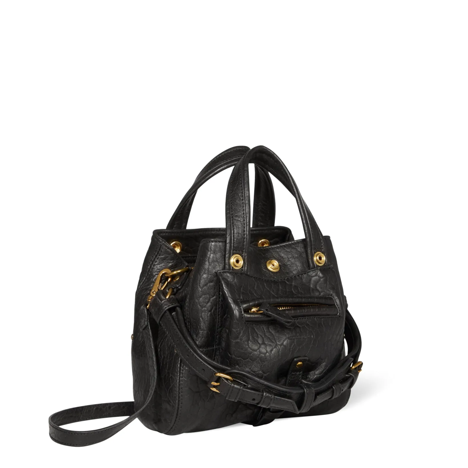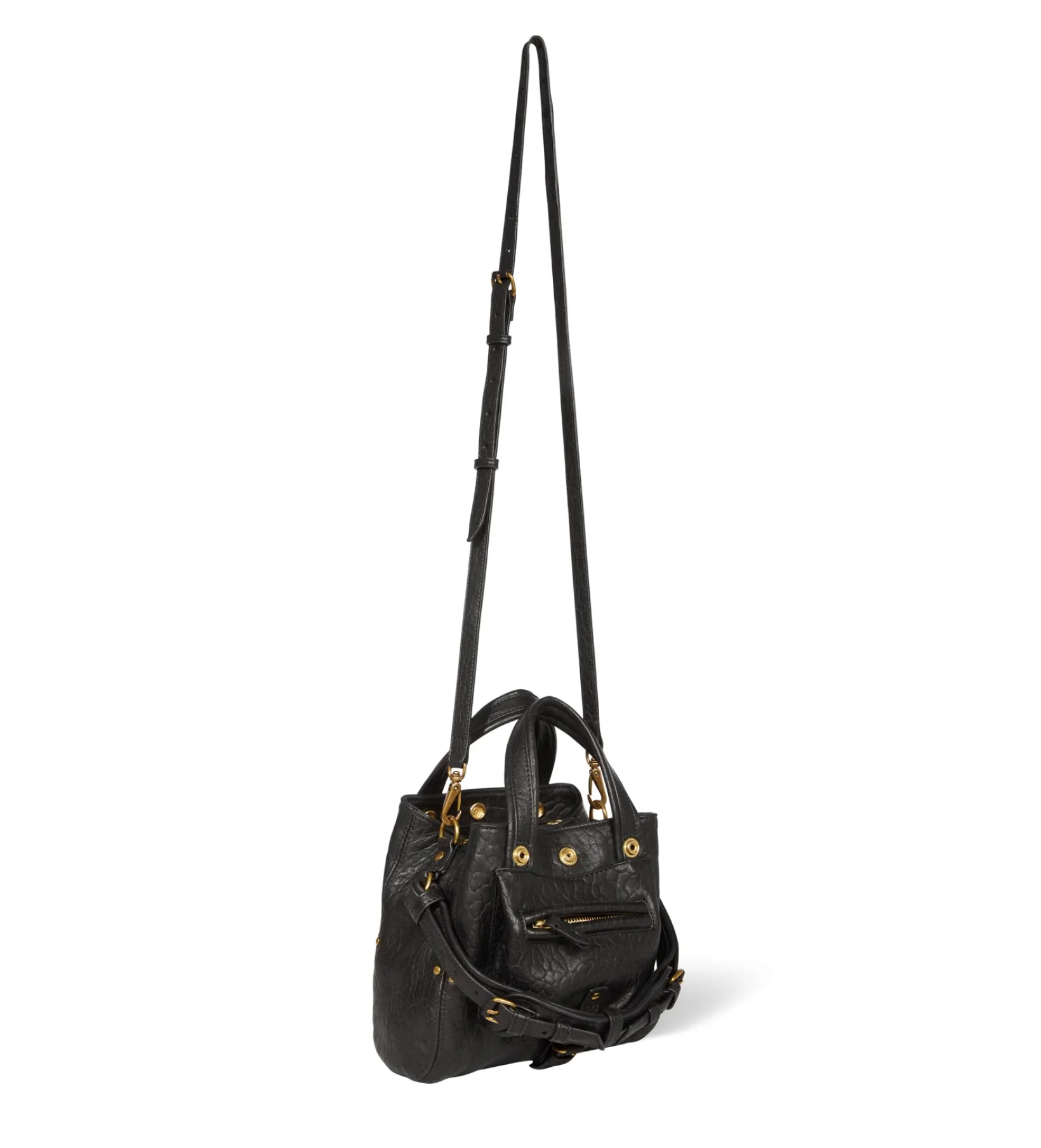 Two leather handles on the top of the bag, height 9 cm. A removable and adjustable leather shoulder strap of maximum 130cm. One external zipped pocket on the front of the bag. One inside pocket. A key ring inside the bag.
