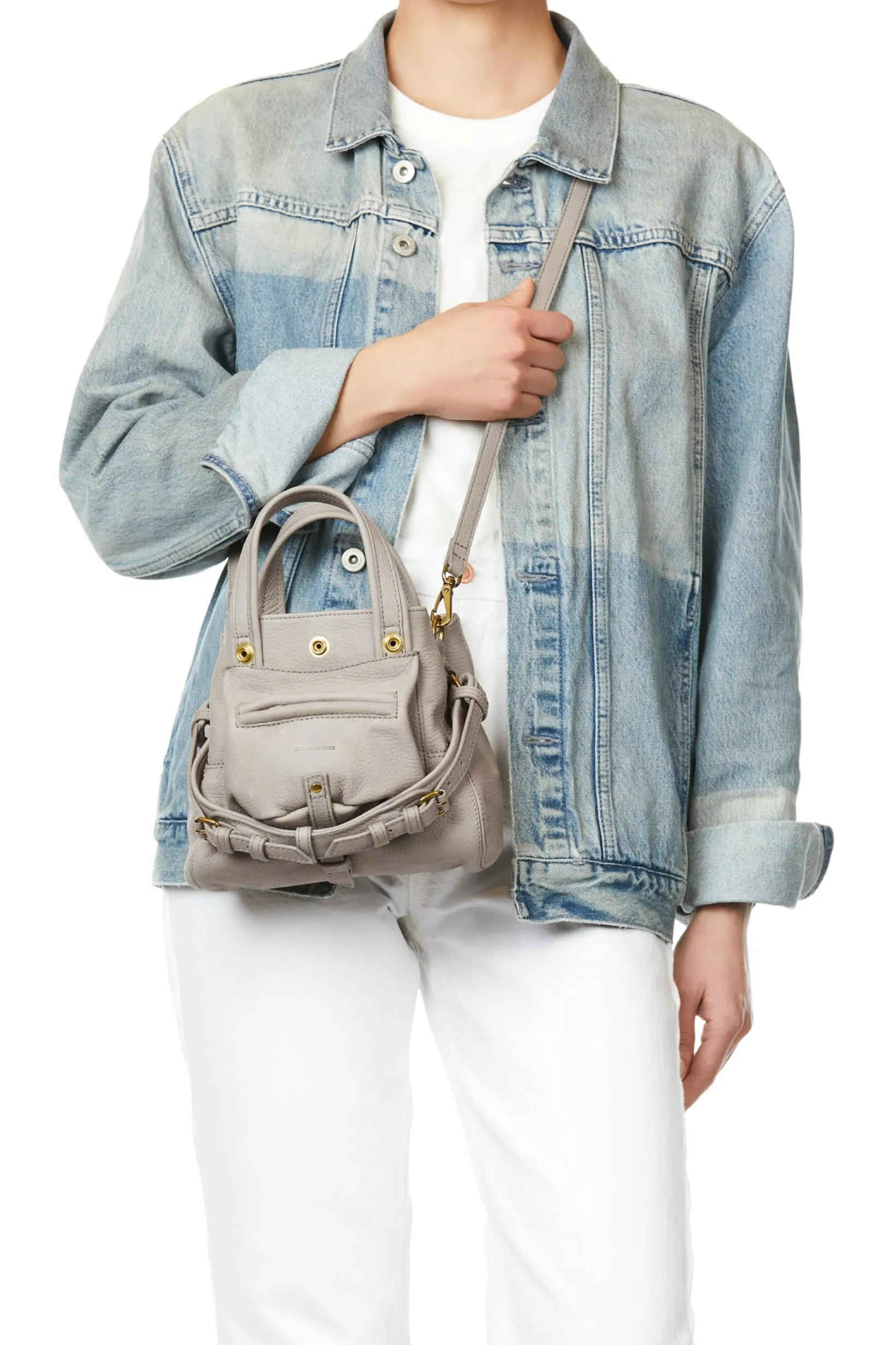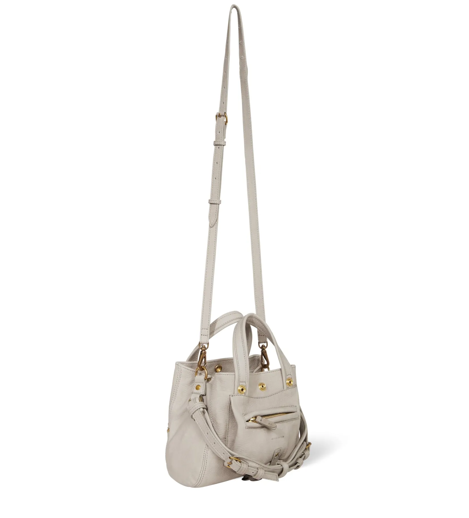 Two leather handles on the top of the bag, height 9 cm. A removable and adjustable leather shoulder strap of maximum 130cm. One external zipped pocket on the front of the bag. One inside pocket. A key ring inside the bag.