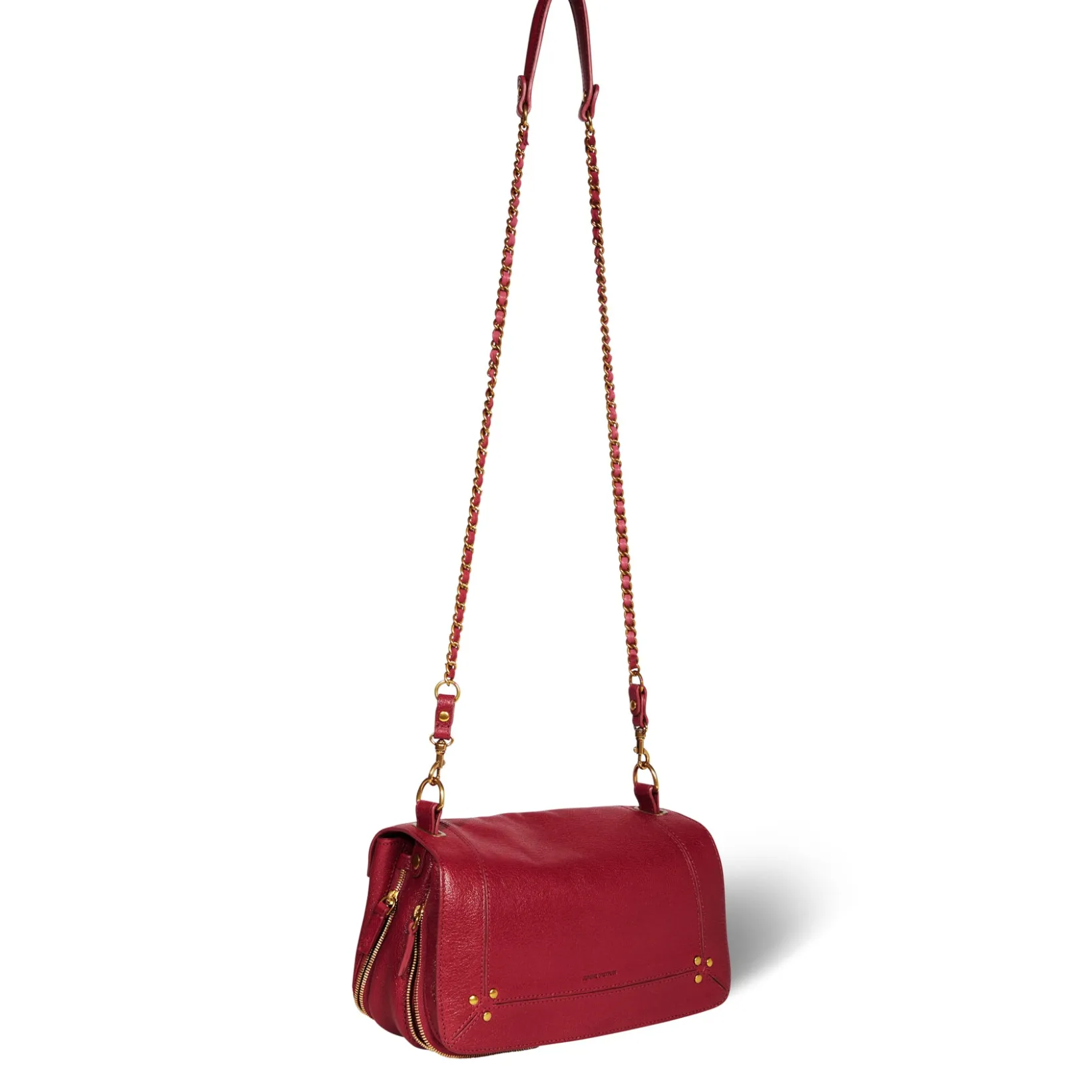 Leather and chain shoulder strap adjustable and two lengths : 65 cm or 105 cm. Leather flap with a double magnetic fastening. Three pouch compartments. Two zip gussets to adjust size. One detachable mirror and key hook inside.Can be associated with all our shoulder straps and handles Handbag 100% Goatskin / Lining 100% CottonDimensions : 25 x 15 x 10 cm