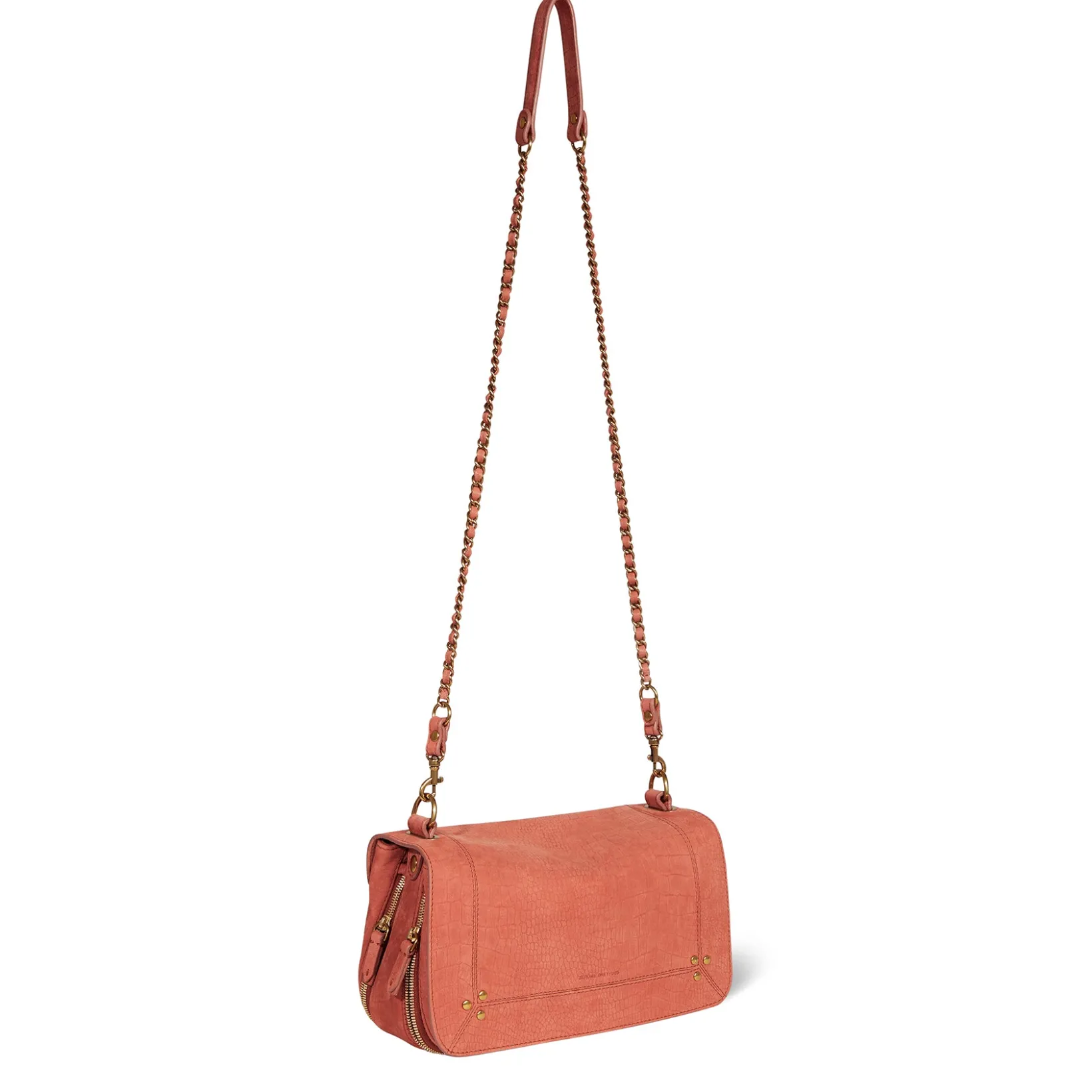 Leather and chain shoulder strap adjustable and two lengths : 65 cm or 105 cm. Leather flap with a double magnetic fastening. Three pouch compartments. Two zip gussets to adjust size. One detachable mirror and key hook inside.