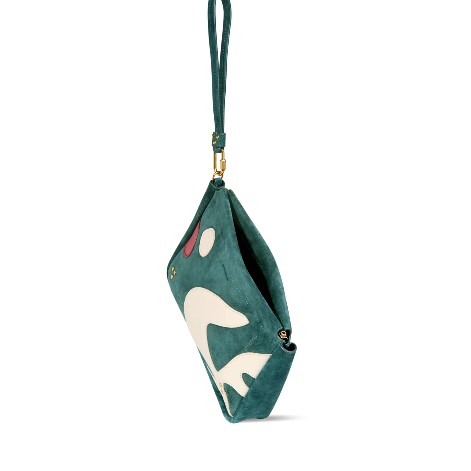 Hand-held, or to slip into a large tote bag. Removable strap thanks to the screw carabiner. Snap closure.