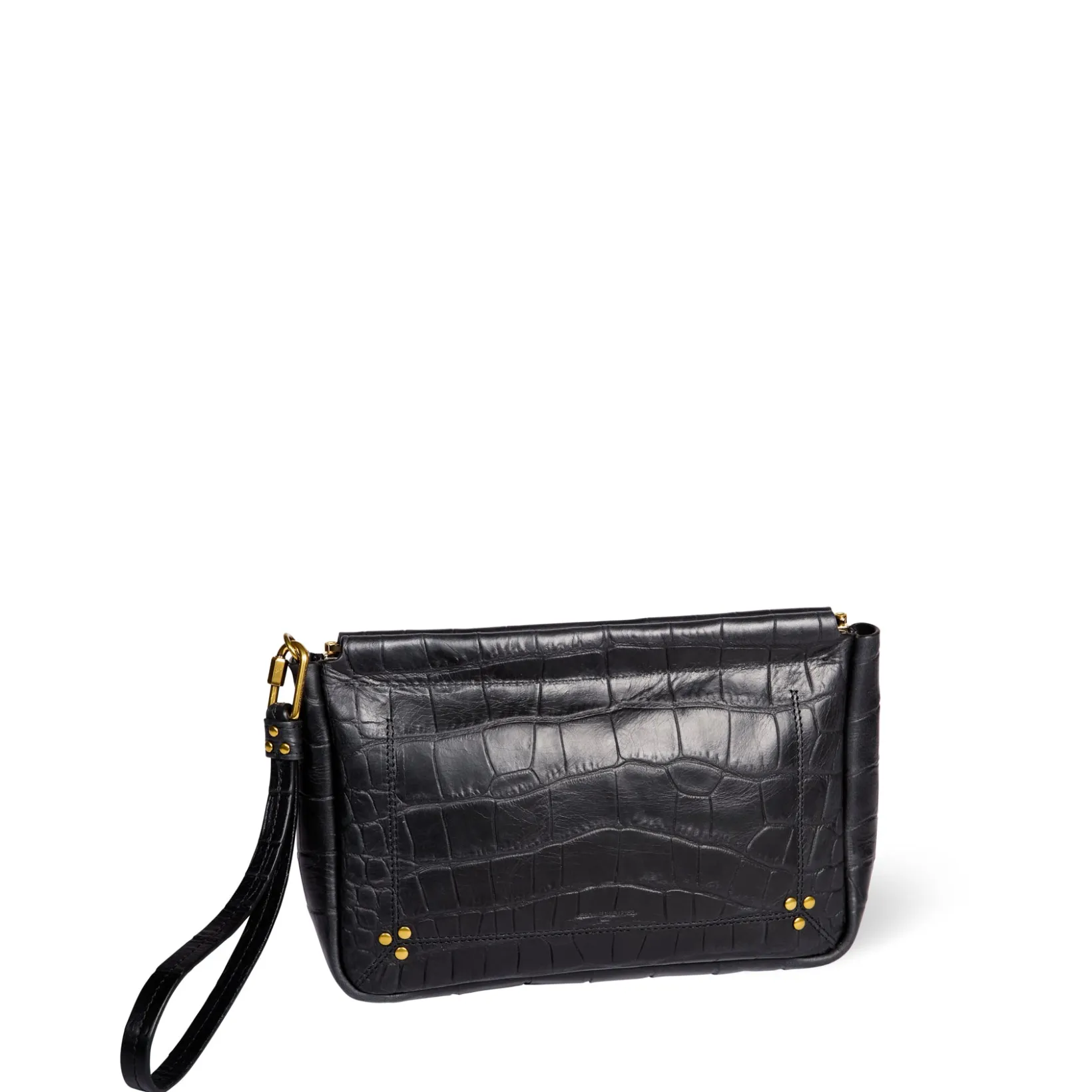 Hand-held, or to slip into a large tote bag. Removable strap thanks to the screw carabiner. Snap closure.