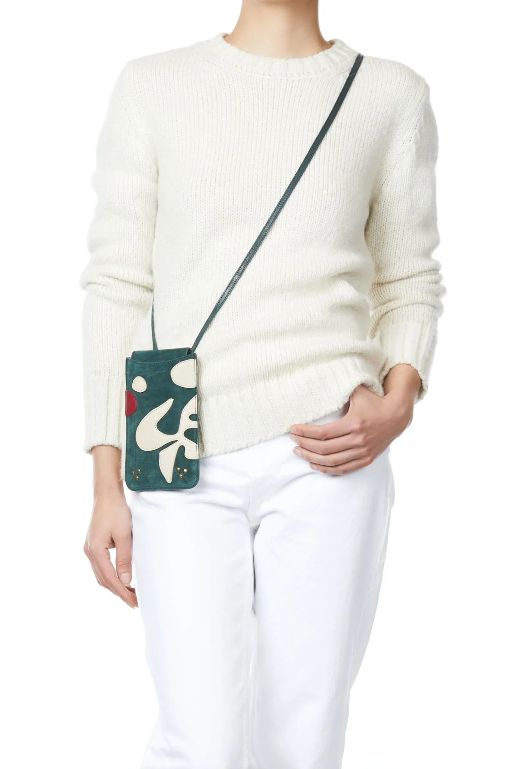 Phone case, to wear cross-body. Snap button closure. Leather strap.