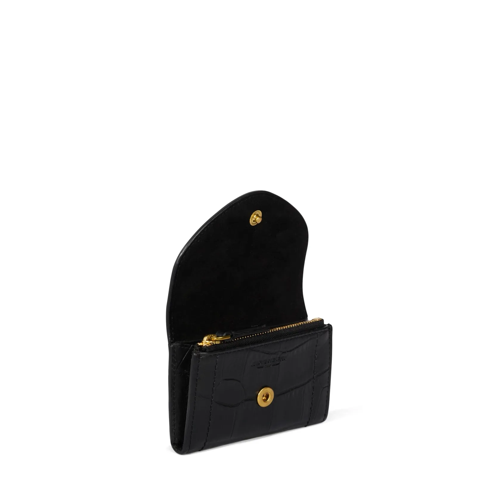 A zipped coin compartment. A storage for bills. Six card compartments. A patch pocket inside and under the flap.