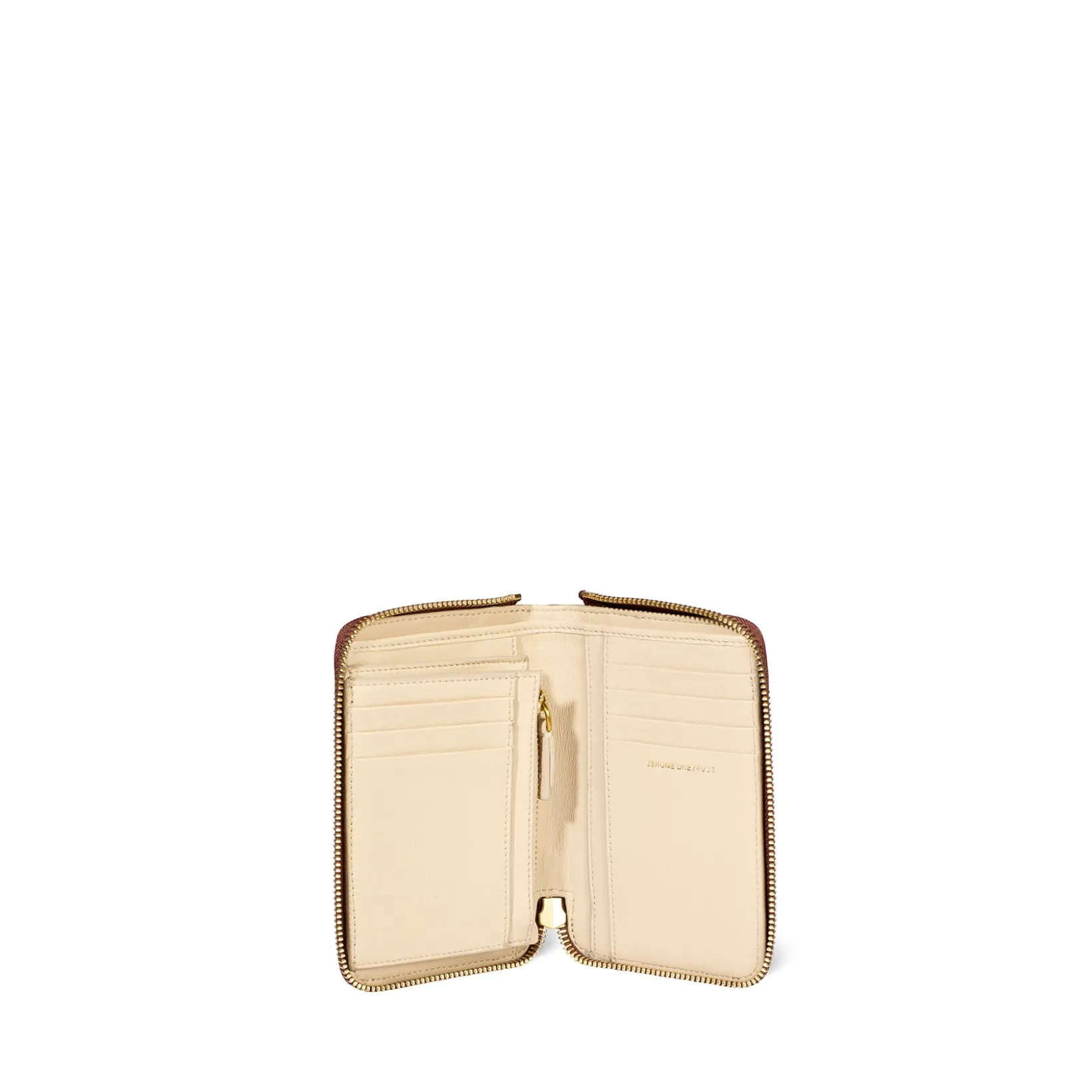 Fastens completely with a zipper. Central zipper compartment for your change. Card slots.