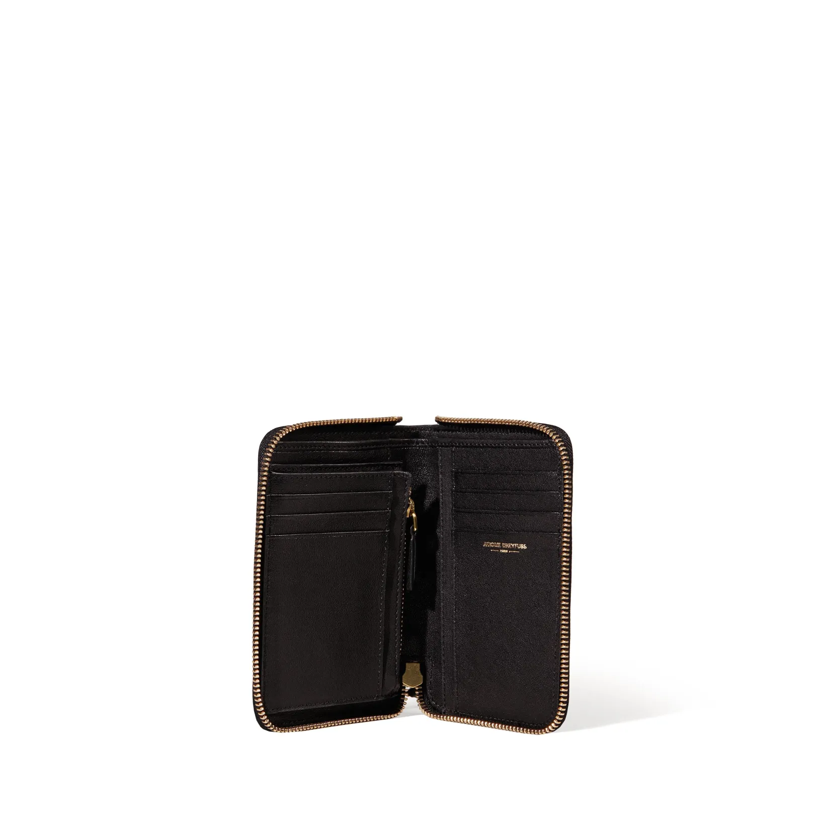 Fastens completely with a zipper. Central zipper compartment for your change. Card slots.