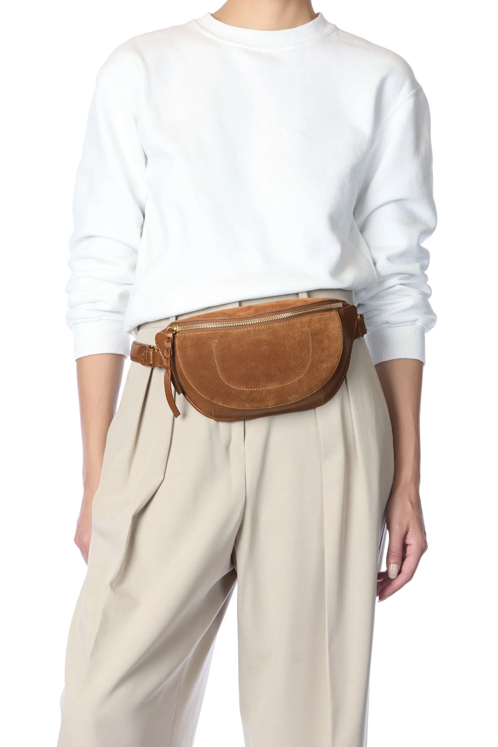 Zipper closure on the top of the bag. An adjustable belt, measuring a maximum of 103 cm. One inside patch pocket. One exterior zippered pocket.