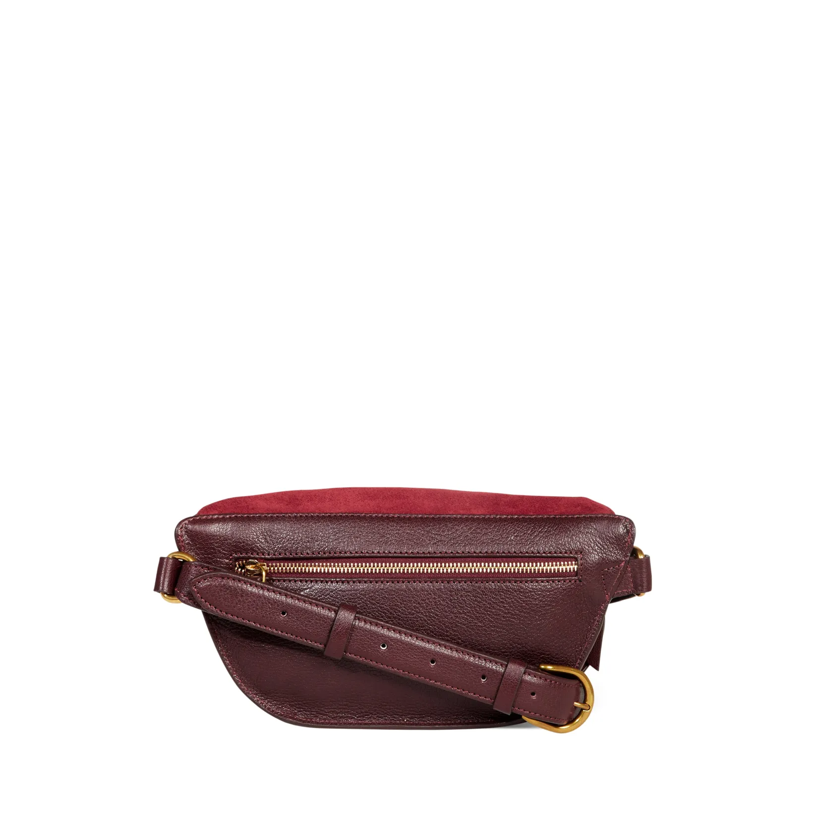 Zipper closure on the top of the bag. An adjustable belt, measuring a maximum of 103 cm. One inside patch pocket. One exterior zippered pocket.