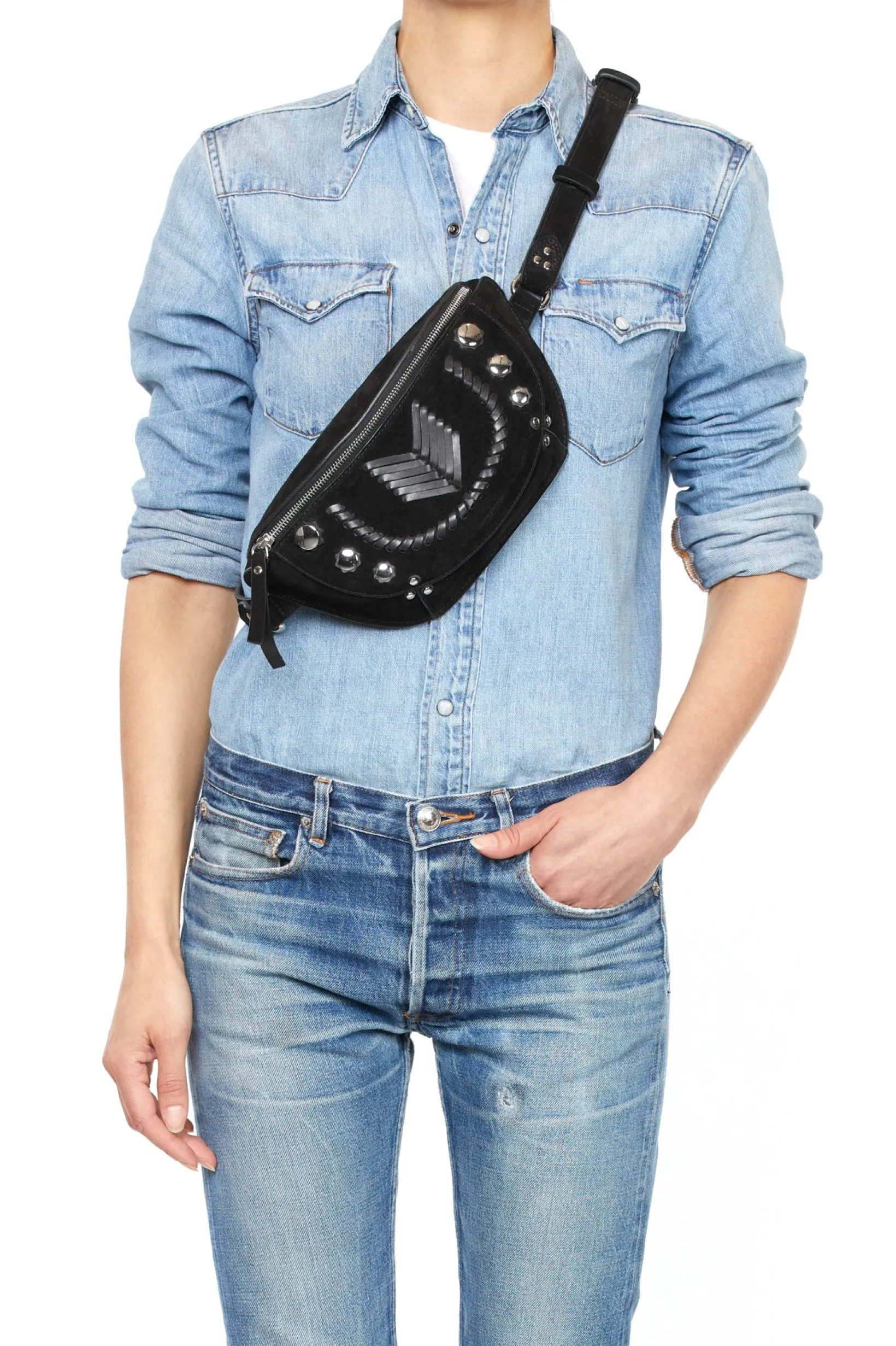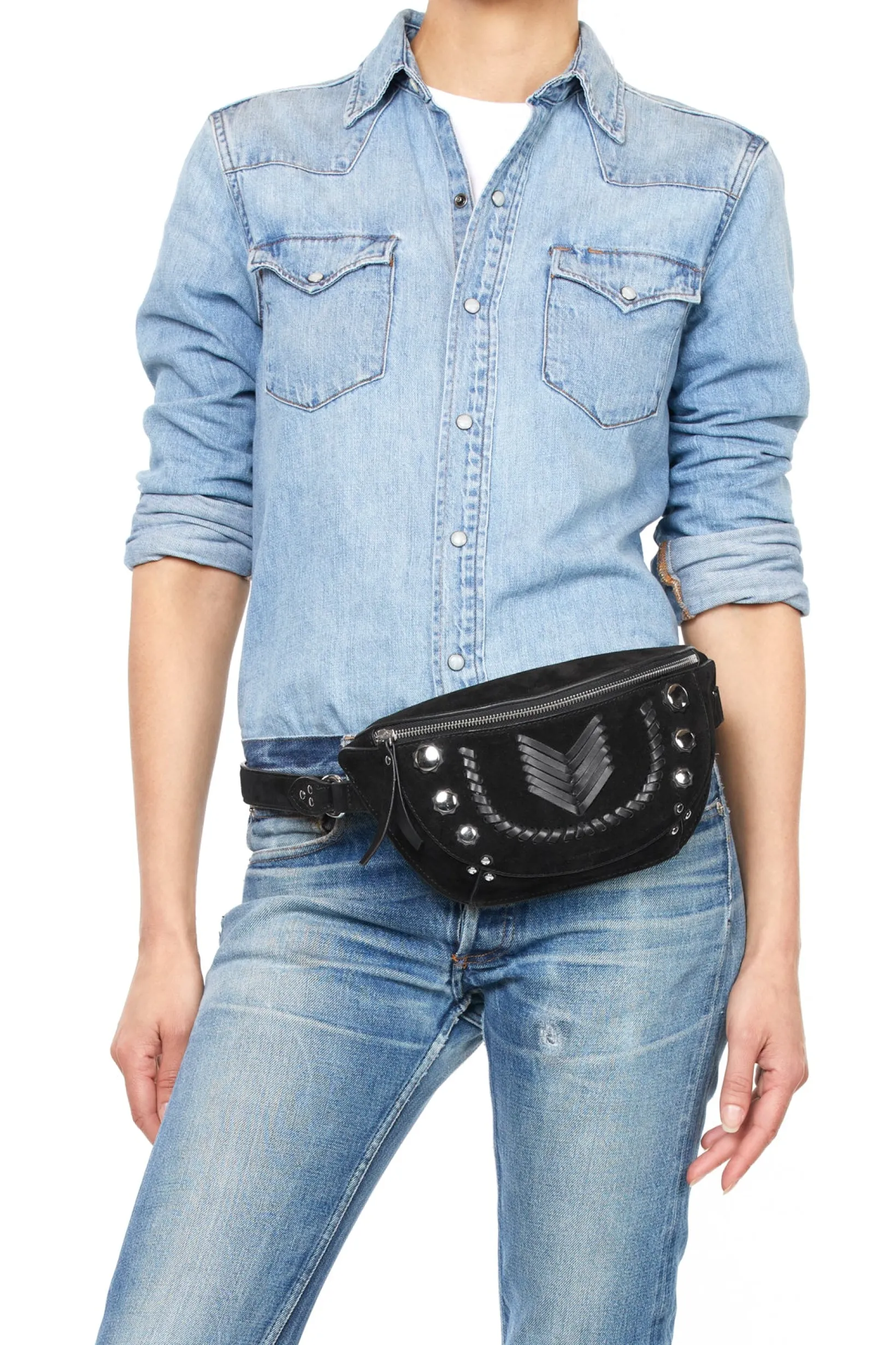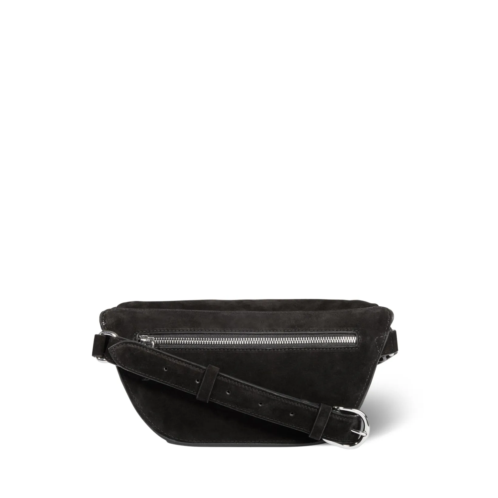 Zipper closure on the top of the bag. An adjustable belt, measuring a maximum of 103 cm. One inside patch pocket. One exterior zippered pocket.