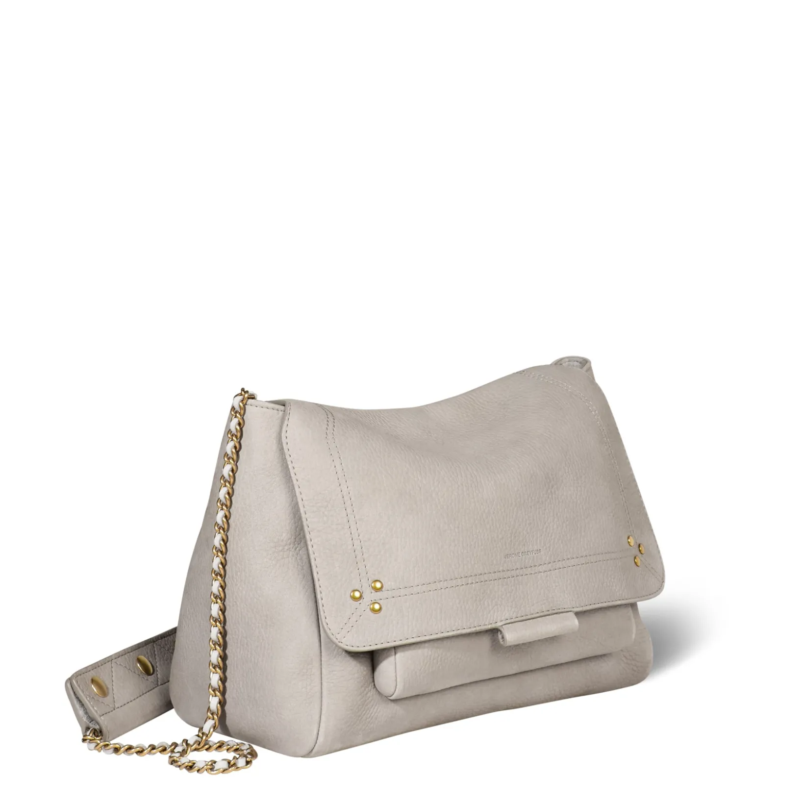 Adjustable chain and leather shoulder strap measuring 105 cm. Wide leg shoulder belt. Flap with snap button closure. One small pocket under the flap. One exterior zipped pocket. One interior pocket. One key hook inside.