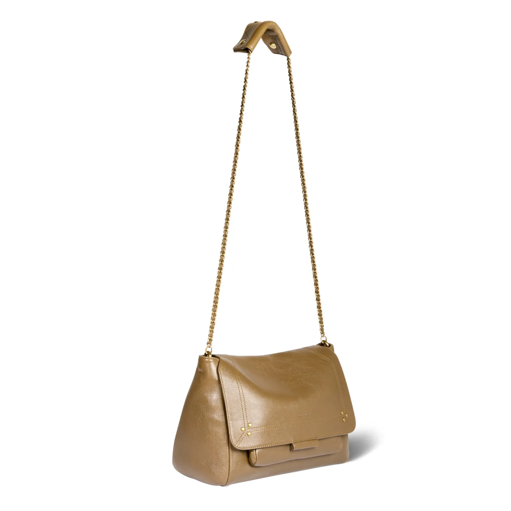 Adjustable chain and leather shoulder strap measuring 105 cm. Wide leg shoulder belt. Flap with snap button closure. One small pocket under the flap. One exterior zipped pocket. One interior pocket. One key hook inside.