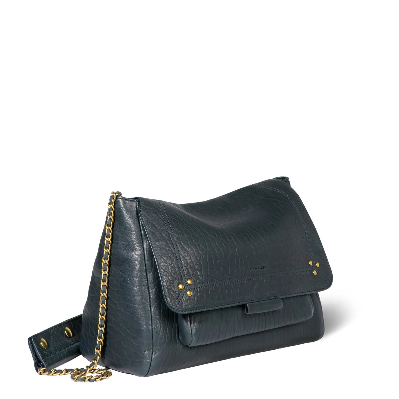 Adjustable chain and leather shoulder strap measuring 105 cm. Wide leg shoulder belt. Flap with snap button closure. One small pocket under the flap. One exterior zipped pocket. One interior pocket. One key hook inside.