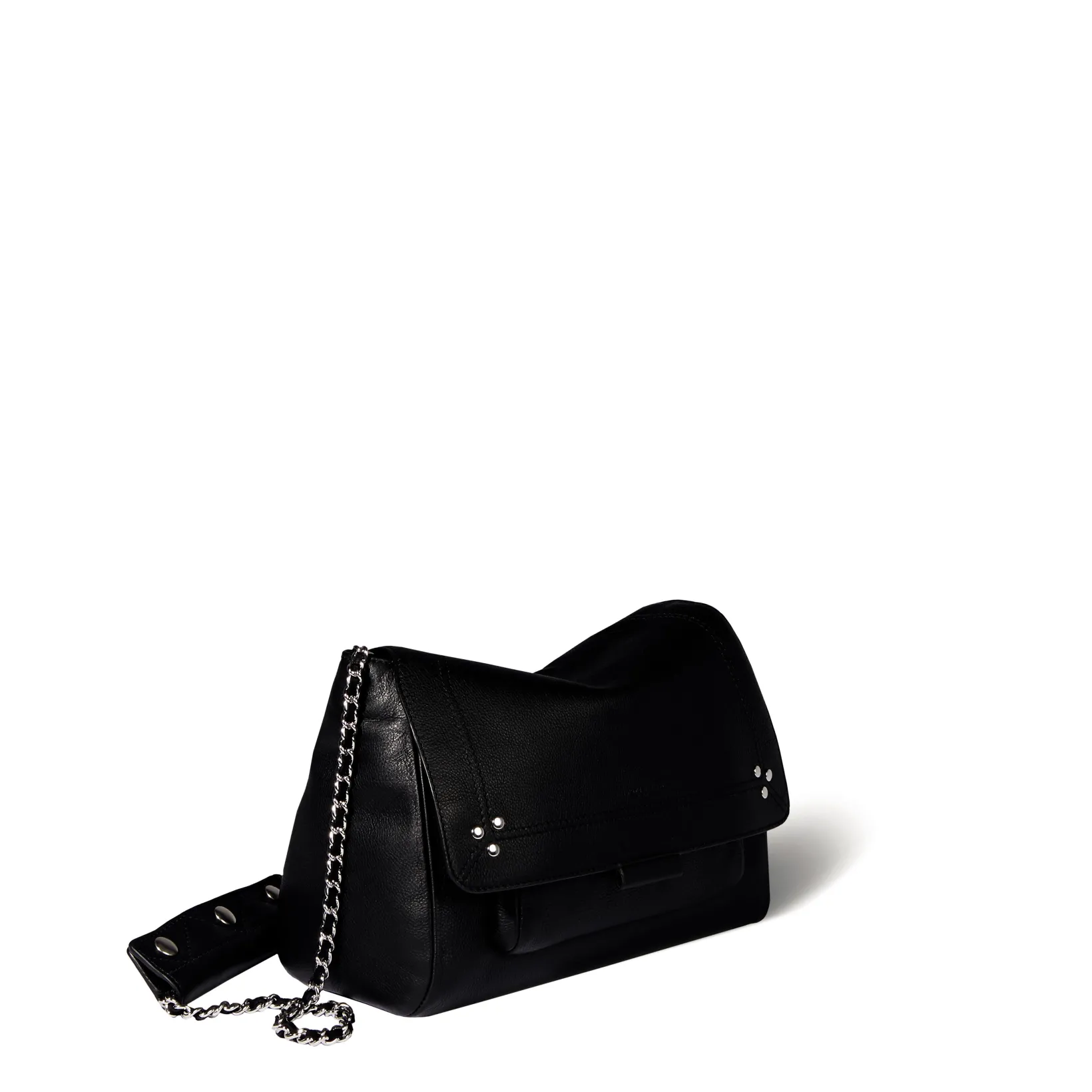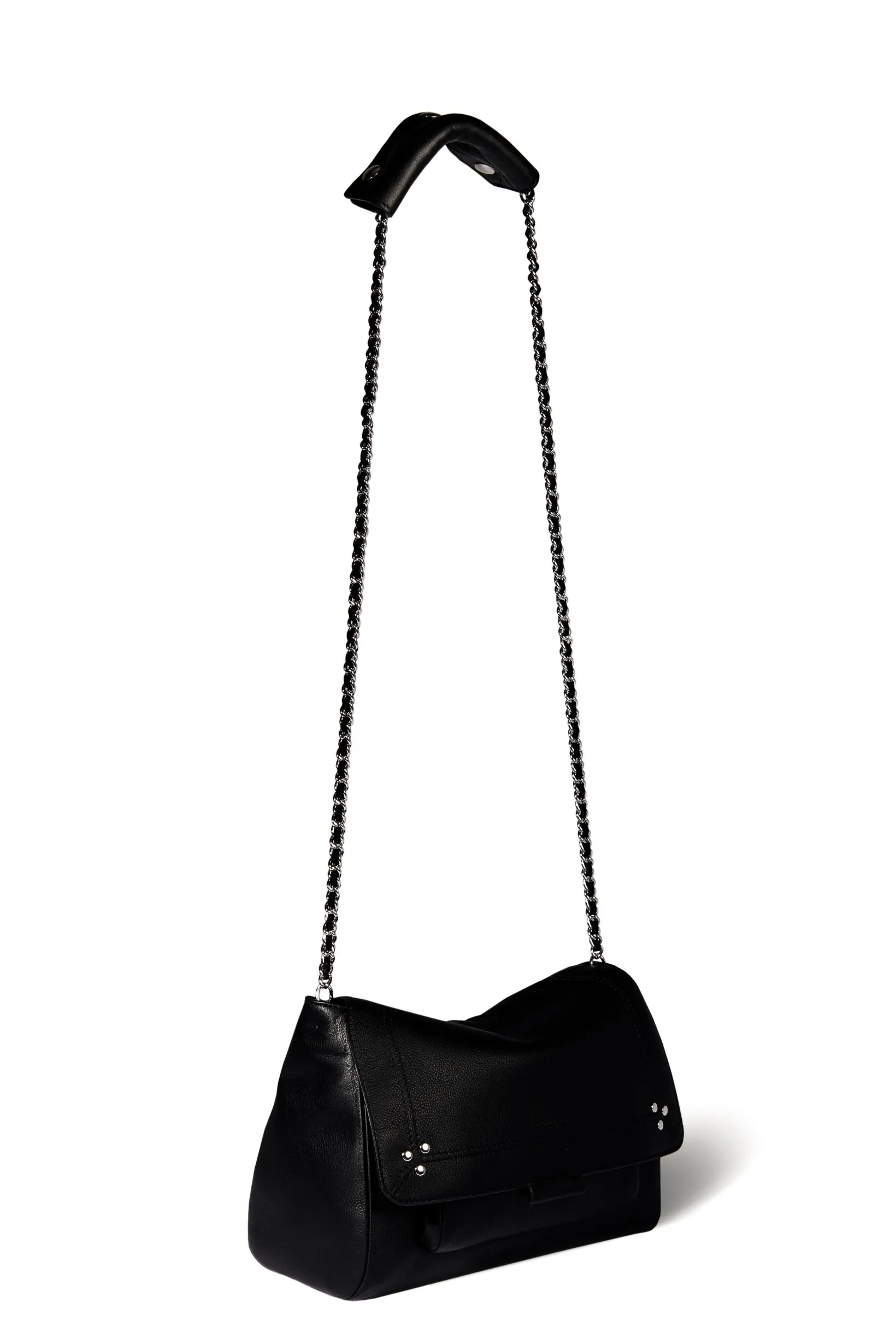 Adjustable chain and leather shoulder strap measuring 105 cm. Wide leg shoulder belt. Flap with snap button closure. One small pocket under the flap. One exterior zipped pocket. One interior pocket. One key hook inside.