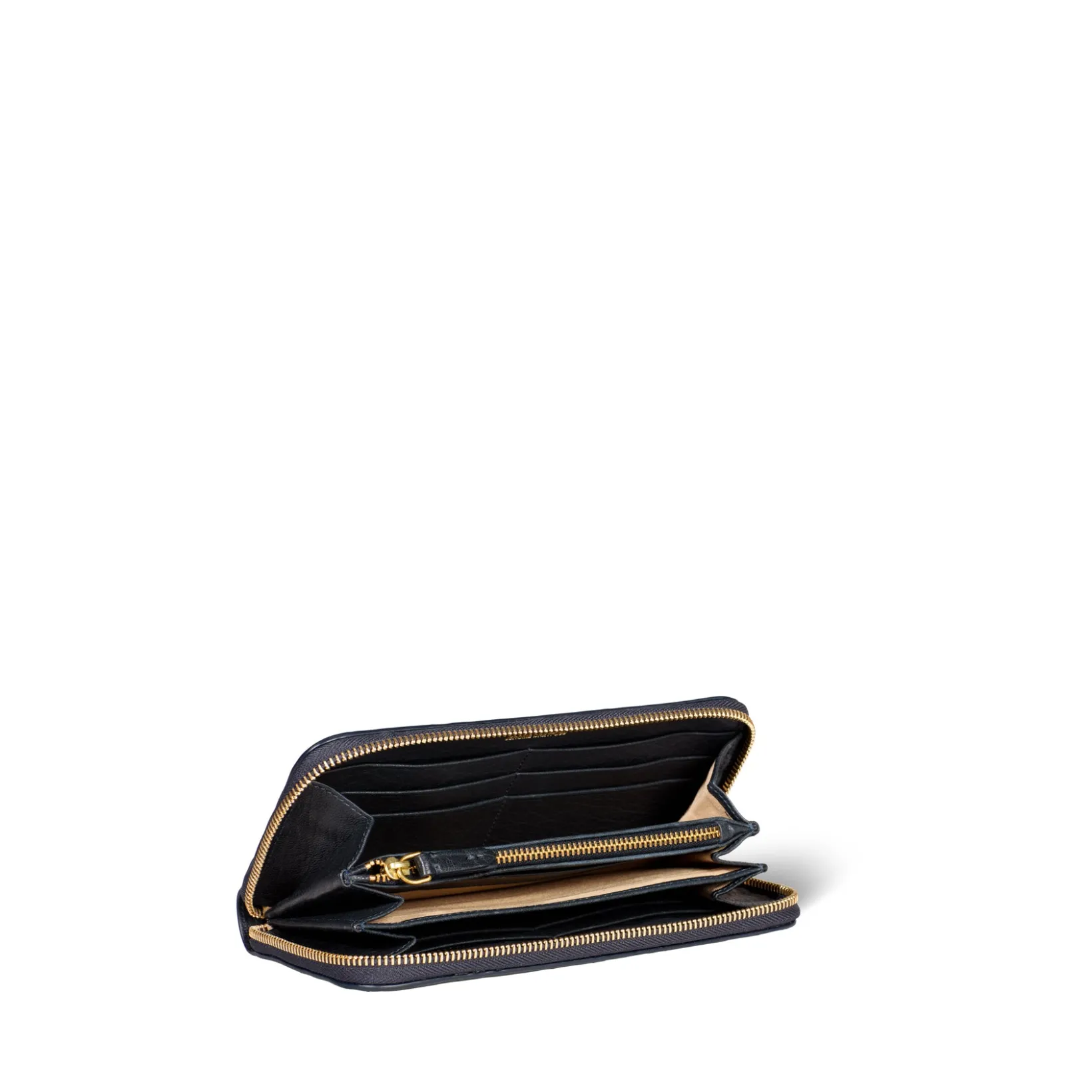 Full zip closure. One zipped coin compartment. Fifteen card slots, bill and ID storage.
