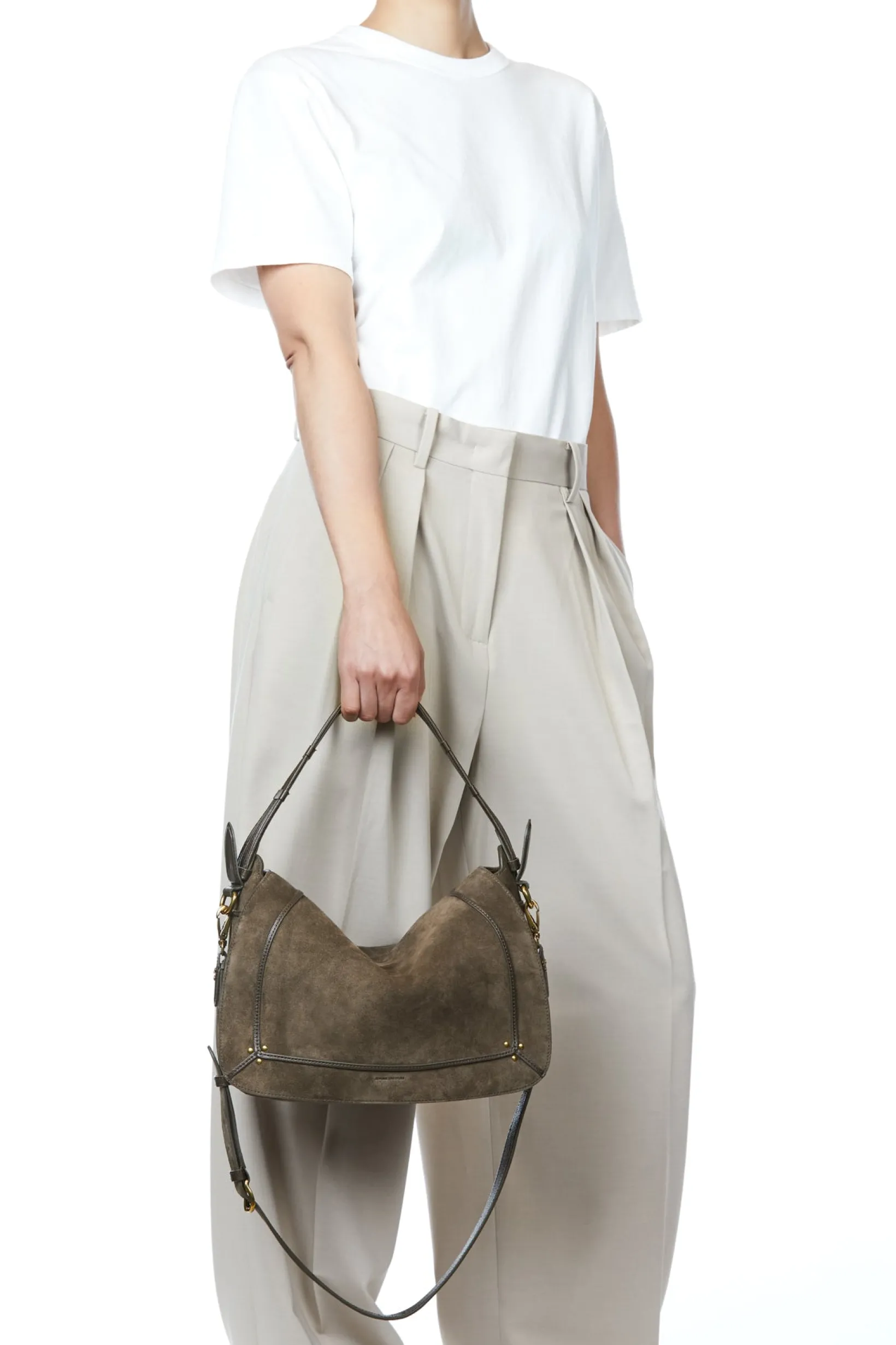 A quilted leather handle and a long adjustable and removable shoulder strap from 66 cm to 97 cm (size S) and from 84 cm to 115 cm (sizes M and L). Closure with a magnetic leather flap. A zippered exterior pocket at the back of the bag. Interior slip pocket without zipper. A keychain link inside the bag. A clean design with numerous meticulous and discreet craftsmanship details and deconstructed lines. The precise work on the four stitches of the handles highlights the quality and care given to every detail. The shoulder strap and handle attachments feature a relief reminiscent of horse harnesses, adding a touch of elegance and tradition. Dimensions: S: 21 x 19 x 9 cm M: 29 x 23 x 13 cm L: 36 x 28 x 13 cm Made in ItalyHandbag 80% Calfskin 20% Goatskin / Lining 100% CottonDimensions : 36 x 28 x 13 cm /Shoulder strap: 68cm to 85cm longCan be associated with all our shoulder straps